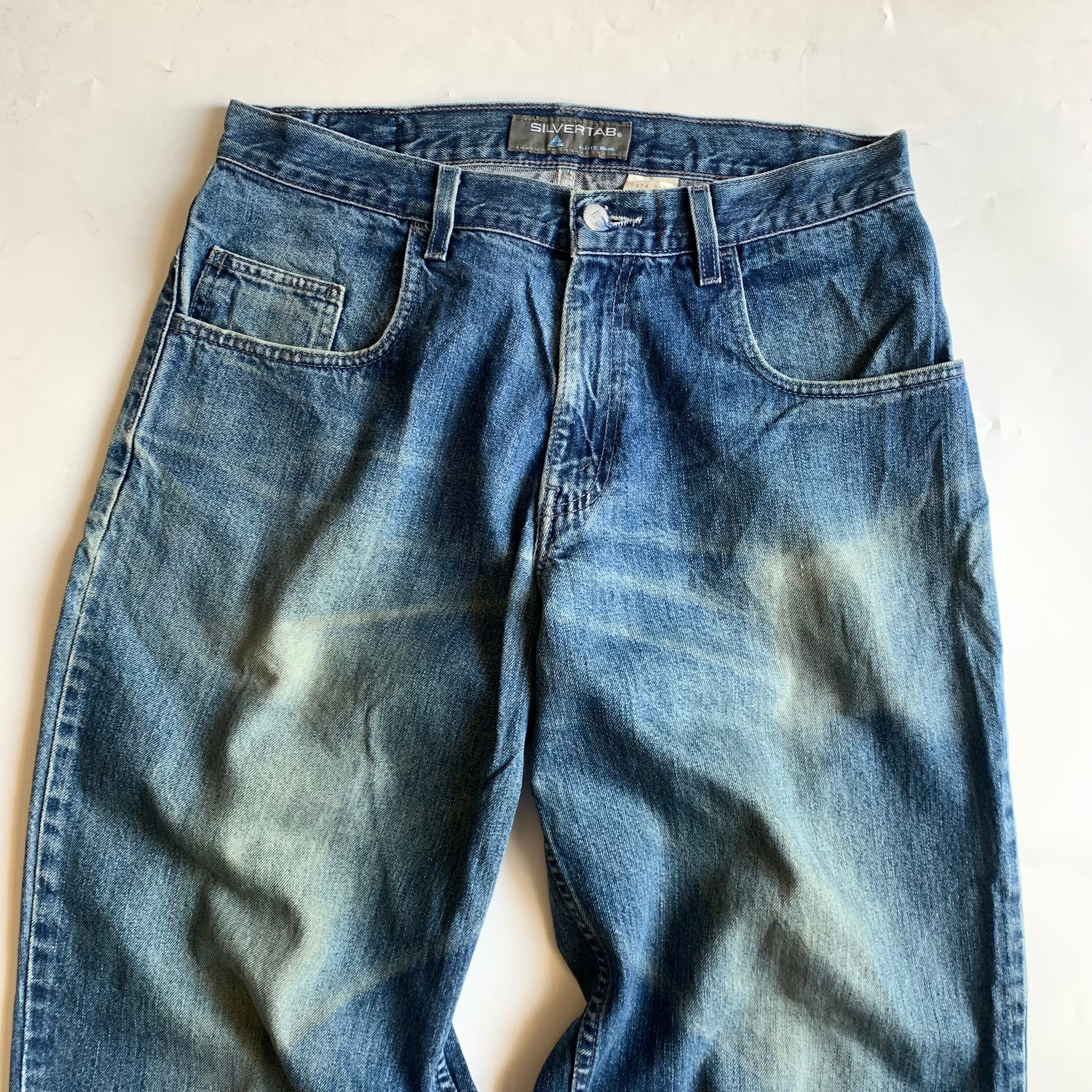 01年製 気分なインディゴブルー •SIZE 32×32 ウエスト84cm 股上30cm 股下81cm 着用者170cm •MATERIAL COTTON 100% •COLOR ブルー •CONDITION 股、裾にダメージあり。 kt261