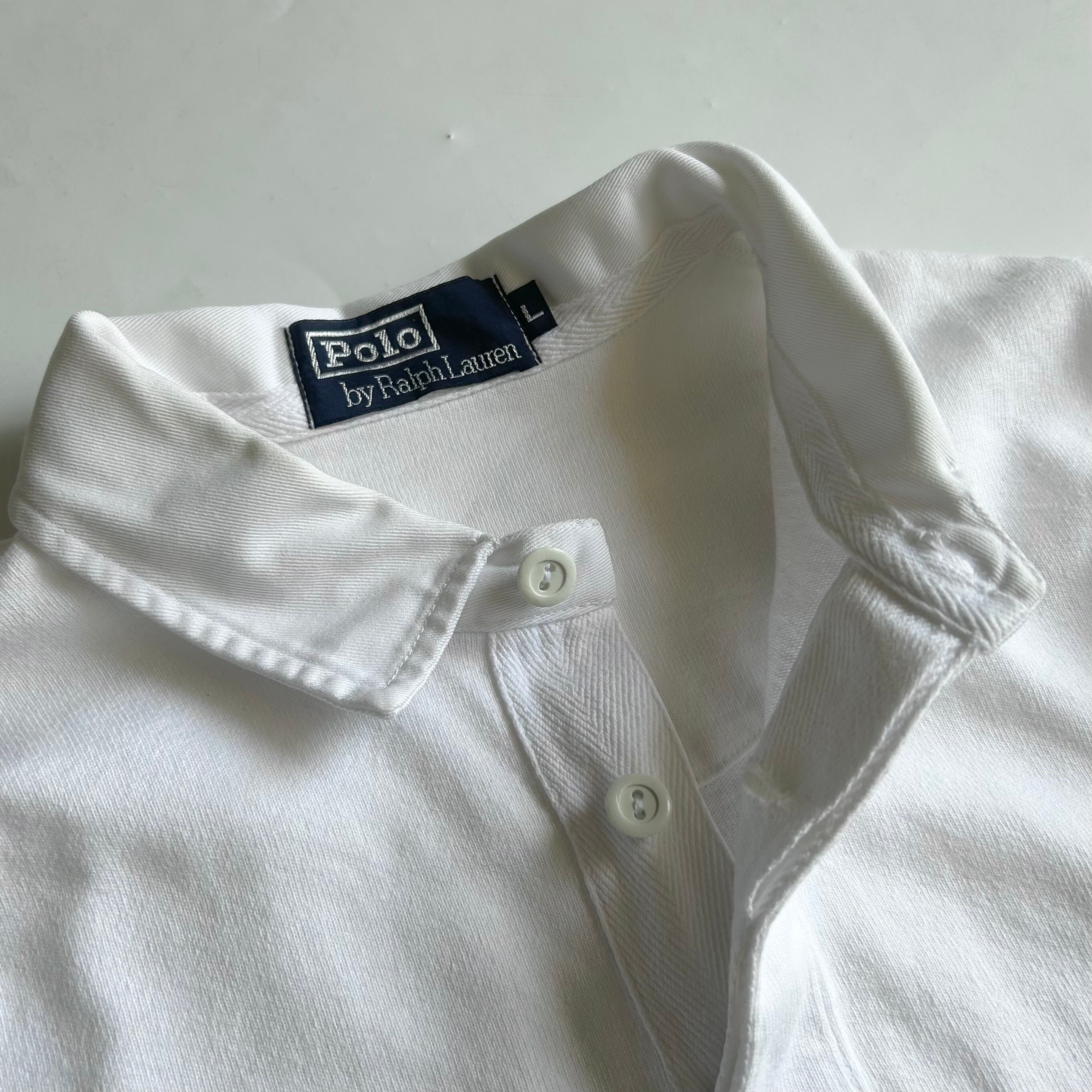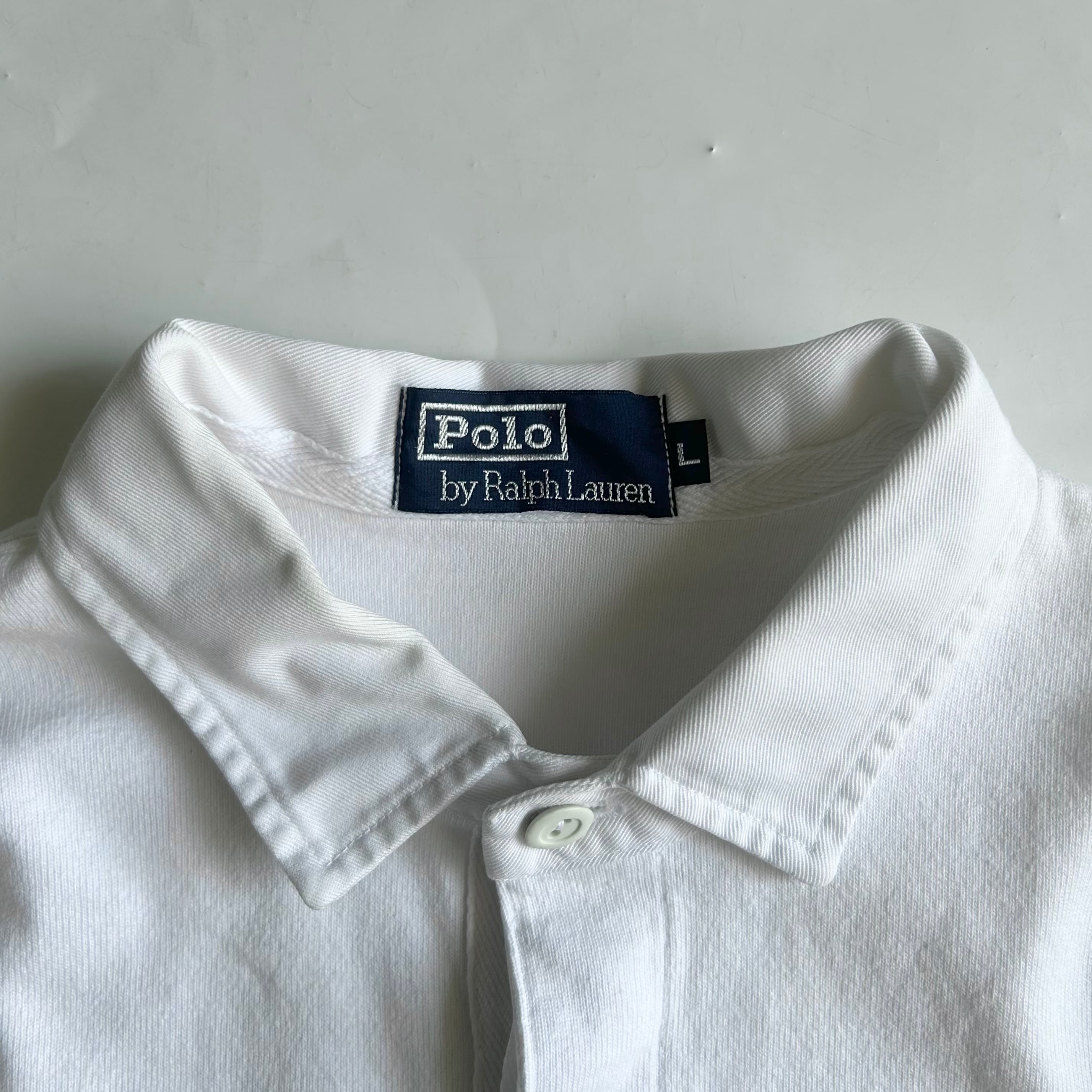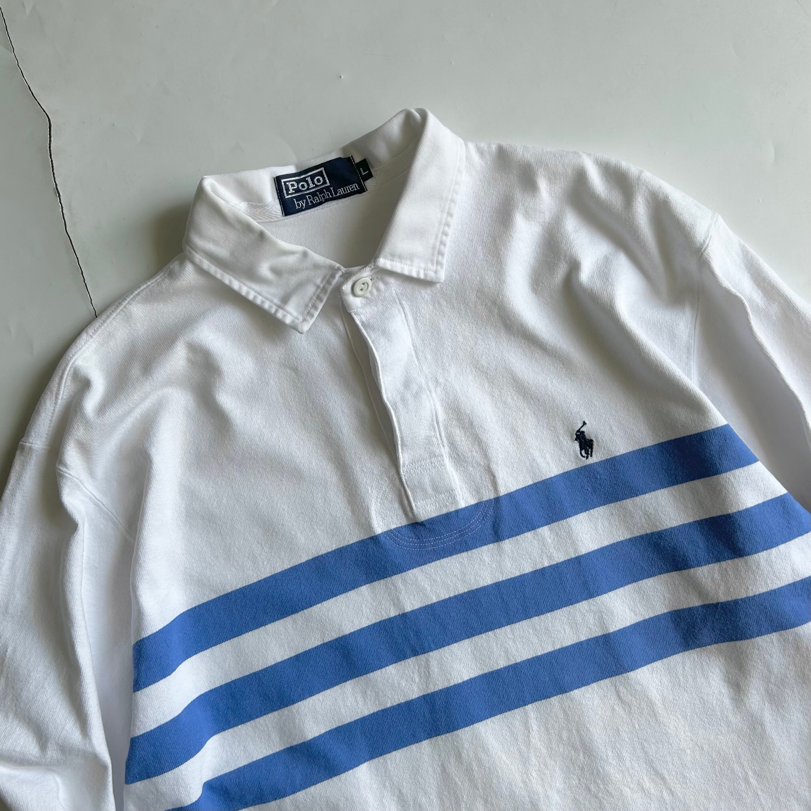 •SIZE L 肩幅 51cm 袖丈 60.5cm 身幅 59cm 着丈 74.5cm •MATERIAL COTTON 100% •COLOR ホワイト ブルー •CONDITION バック、袖、裾内側に汚れあり 写真参照 f671