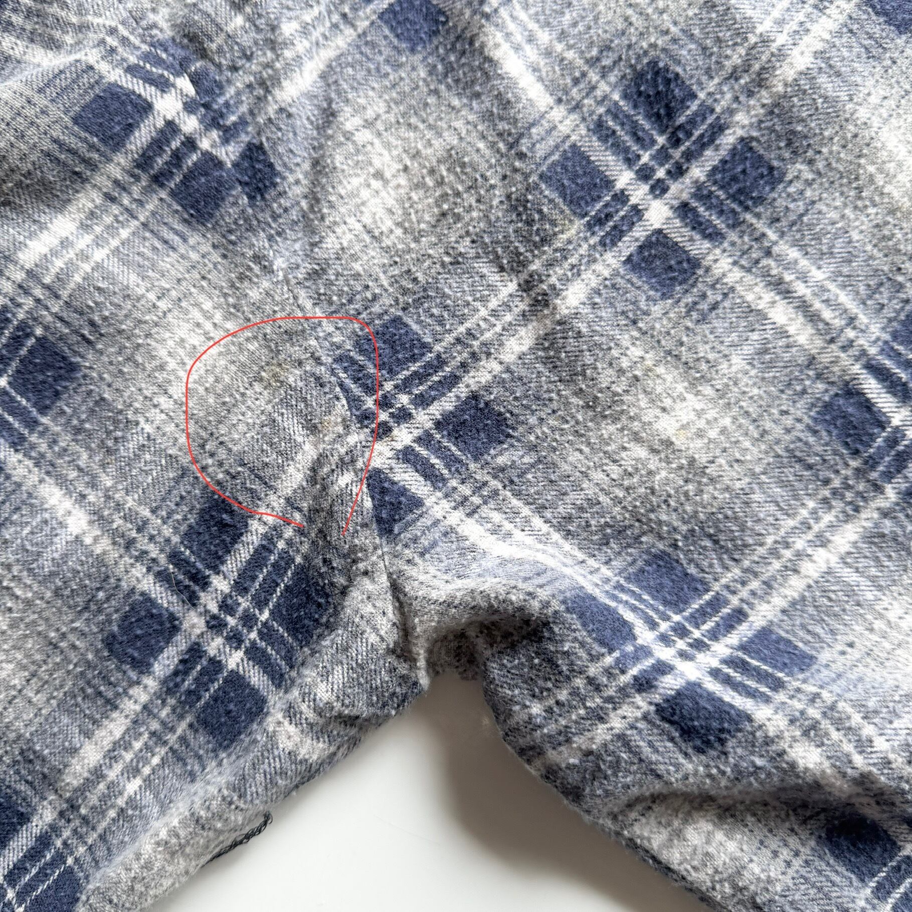 使用感、毛羽立ち、ポケット周りにホツレ、最終ボタンの欠品、裾や脇辺りにシミ。