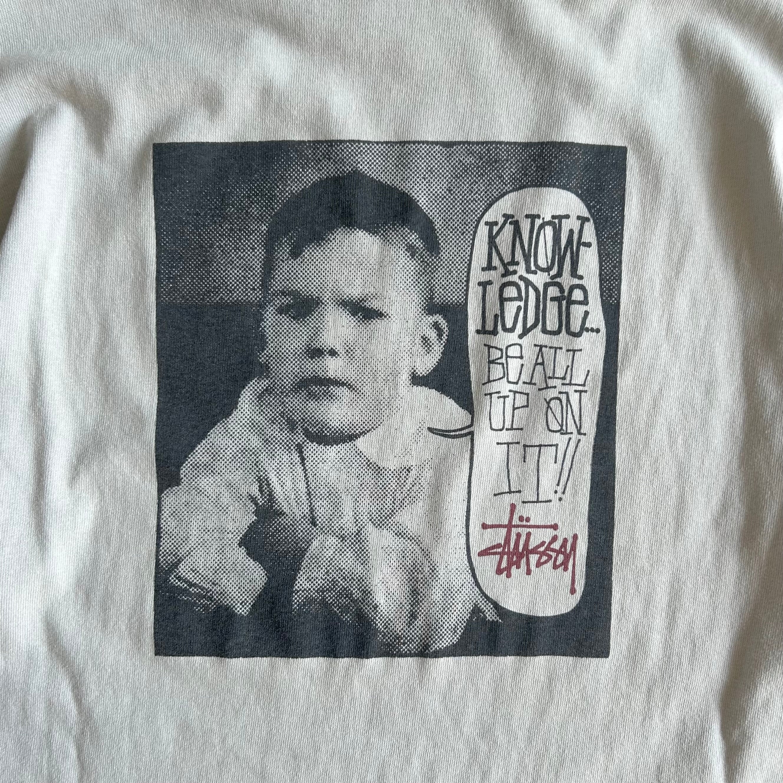 "KNOWLEDGE... BE ALL UP ON IT!" お馴染み思想強めのメッセージ。ベイビーフォト。 •SIZE M 肩幅 49cm 袖丈 22cm 身幅 48.5cm 着丈 70cm •MATERIAL Cotton100% •COLOR グレー •CONDITION バックに色褪せあり 首元黄ばみあり 写真参照 168cm着用