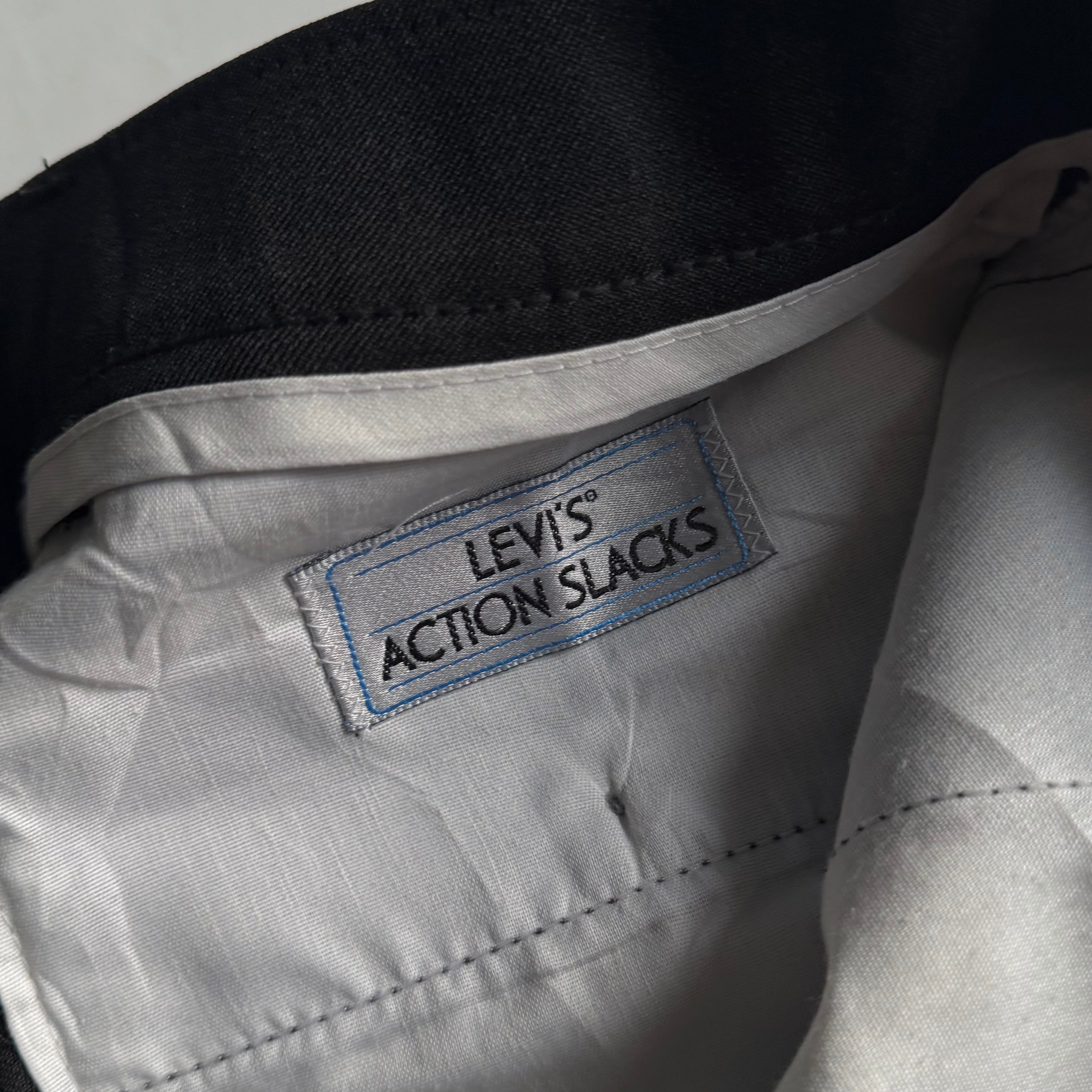•SIZE W36 L30 ウエスト 92cm 股上 34cm 股下 77cm わたり 33cm 裾幅 23cm 175cm着用(ベルトで絞ってハイウエスト) •MATERIAL POLYESTER 100% •COLOR ブラック •CONDITION 使用感、フロントに多少の毛玉、ホツレ。着用には問題ございません。写真にてご確認下さい。 ya6105