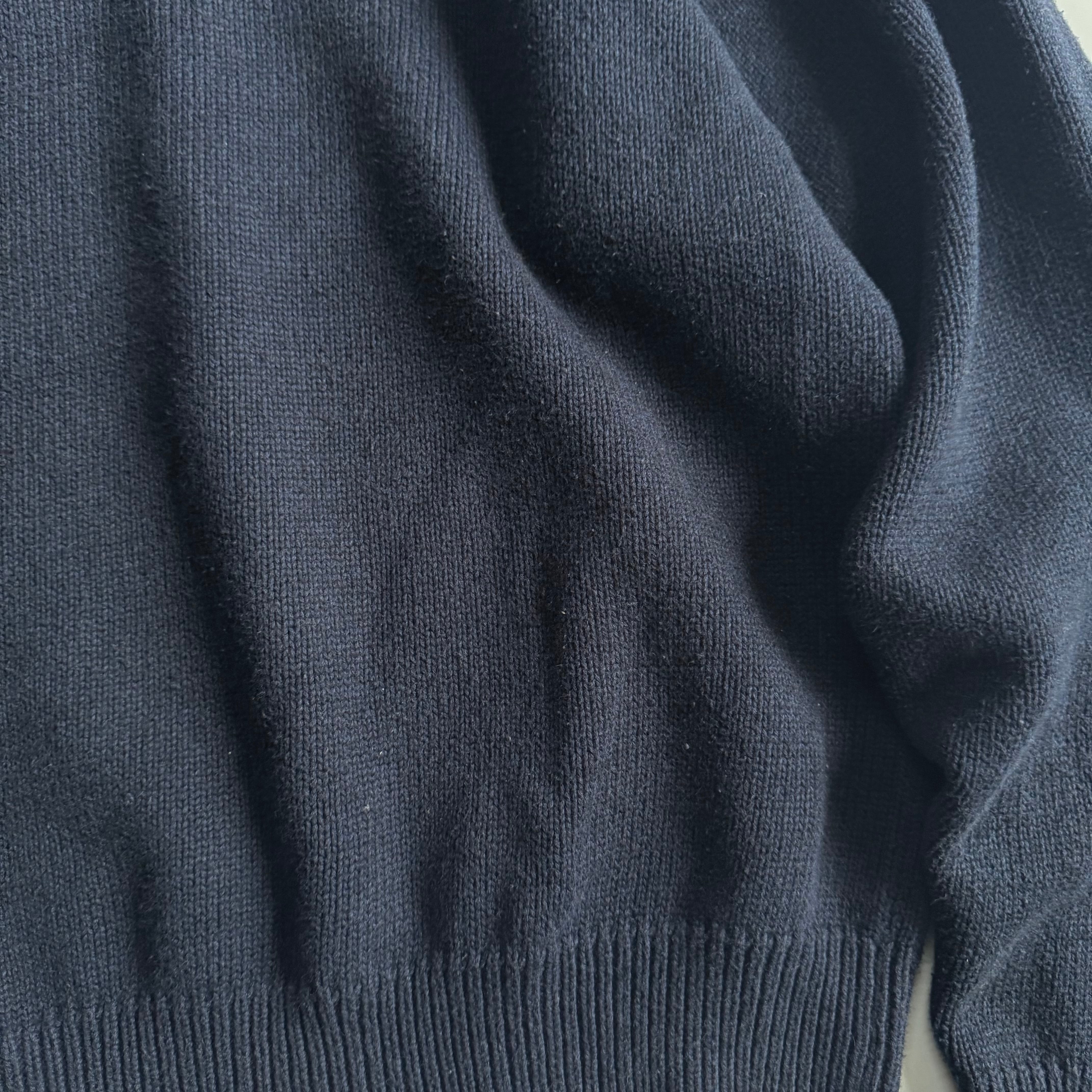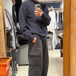 扱いやすいc100のクルーネック。ローゲージとハイゲージの中間で、身幅広め、着丈短め。ゴールデンサイズのMサイズです。