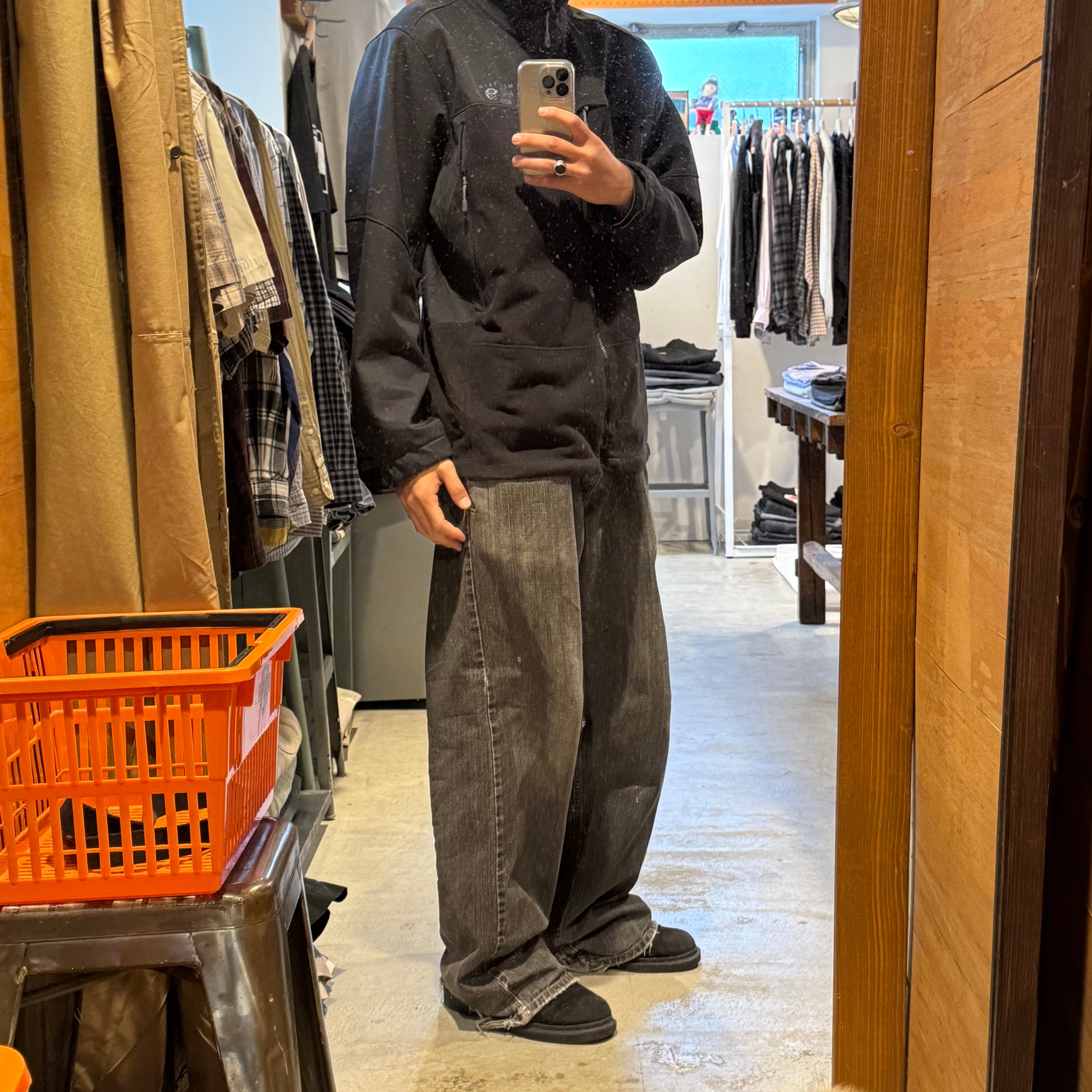 マウンテンハードのフリース切り替えソフトシェル。気取らないカラーで、シティーに映える雰囲気◎少し厚めのジャージ感覚でどうぞ