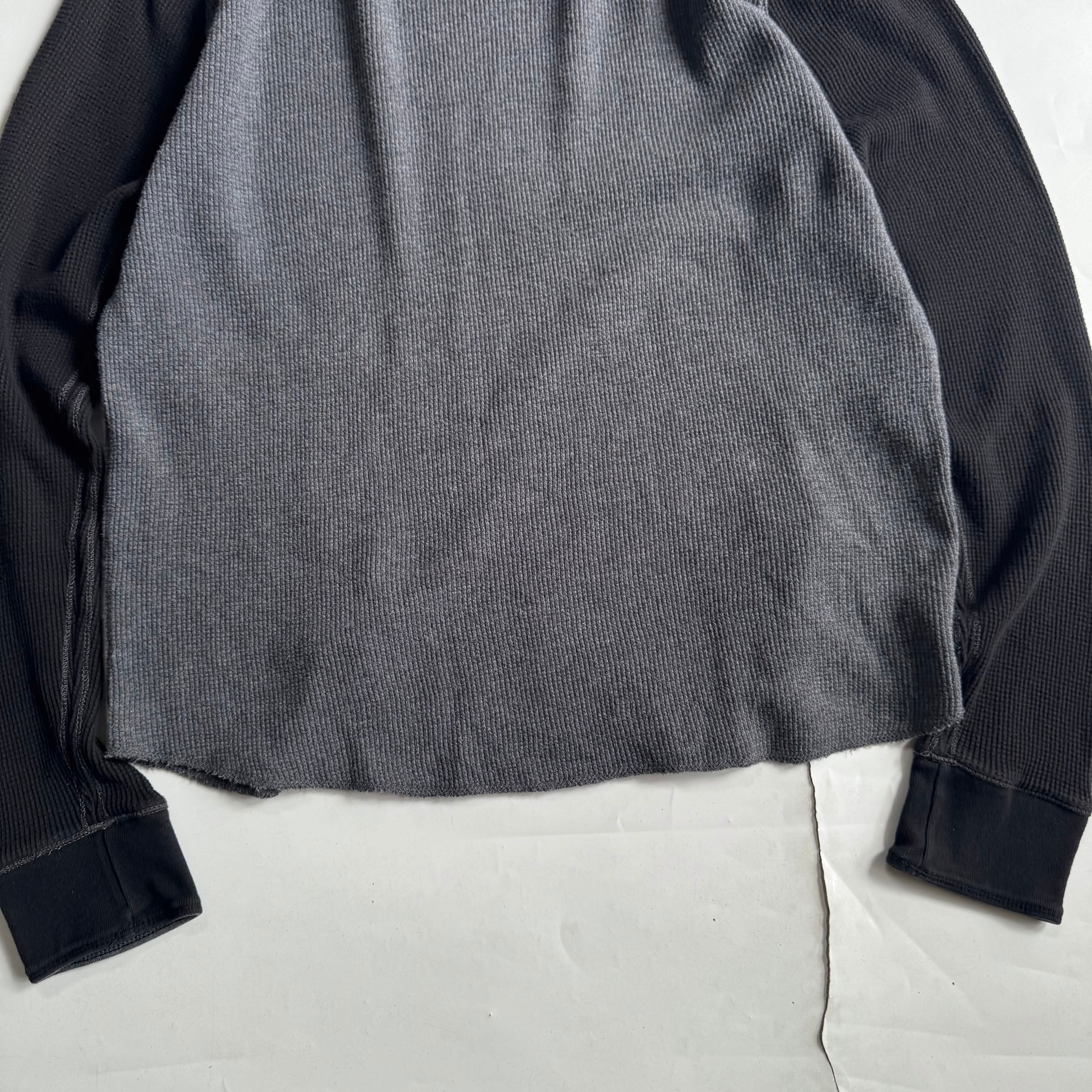 クールな2トーン サーマルなんでナローな袖としっかりした袖口のリブ◎。インナーやレイヤーにはもちろん、一枚でも雰囲気あります。 •SIZE L 裄丈 96cm 身幅 60cm 着丈 69cm •MATERIAL COTTON 100% •COLOR ブラック グレー •CONDITION 使用感、フロントに汚れ。 写真にてご確認下さい。 ya6278