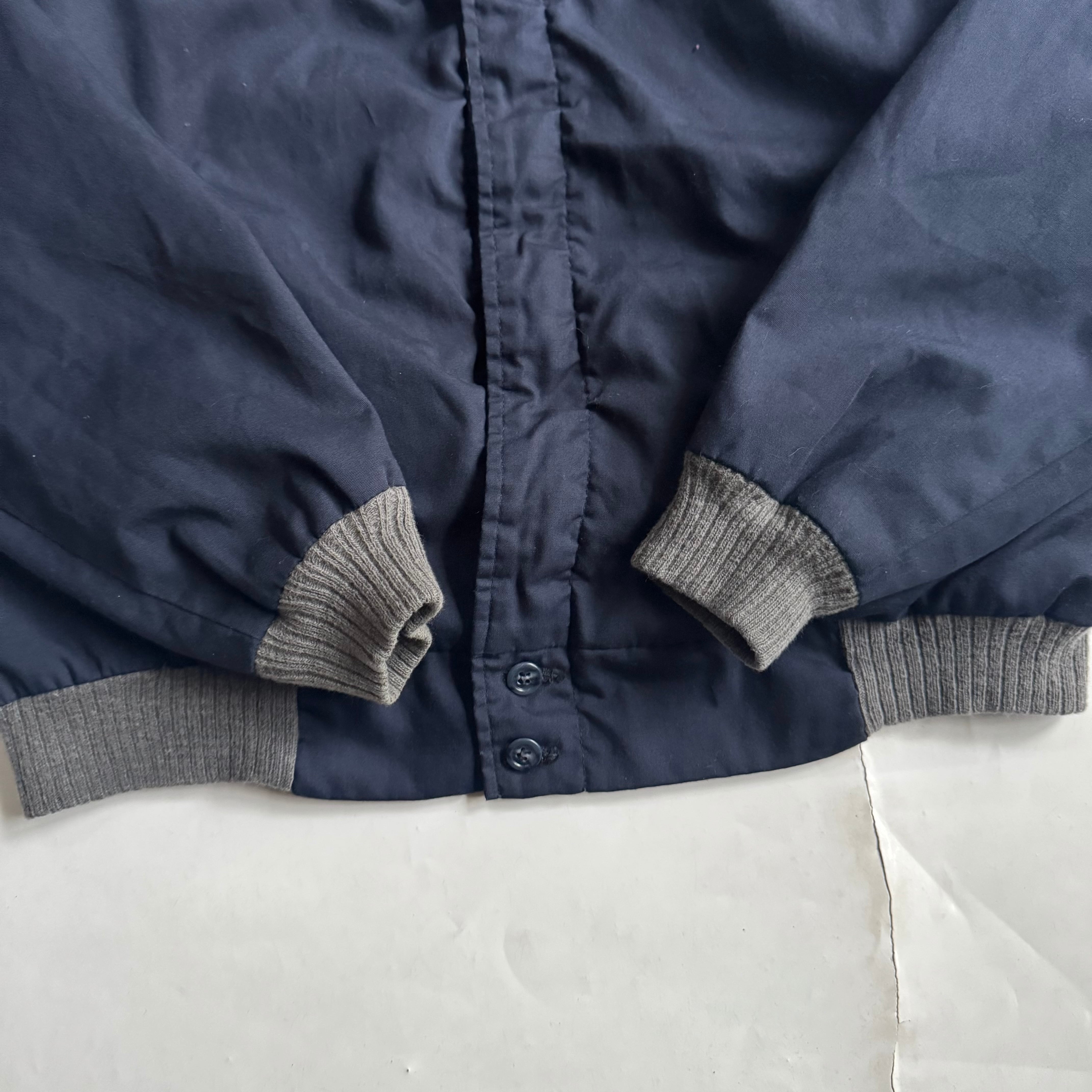 ヴィンテージのダービーjkt グレーのリブや裏地◎ •SIZE 42 肩幅 54cm 袖丈 60cm 身幅 59.5cm 着丈 61cm 175cm着用 •MATERIAL 恐らく COTTON POLYESTER •COLOR ネイビー系 •CONDITION 使用感はございますが、目立った傷や汚れ等はございません。 kt494