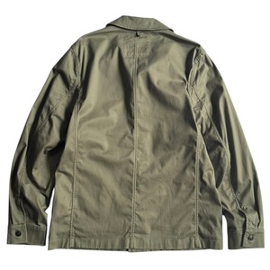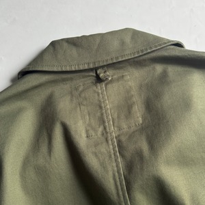 コットンツイルのチョアジャケット 諸所無骨で大人な印象 •SIZE M 肩幅 47cm 袖丈 67.5cm 身幅 57cm 着丈 72.5cm 175cm着用 •MATERIAL COTTON 98% SPANDEX 2% •COLOR カーキグリーン •CONDITION デッドストック。