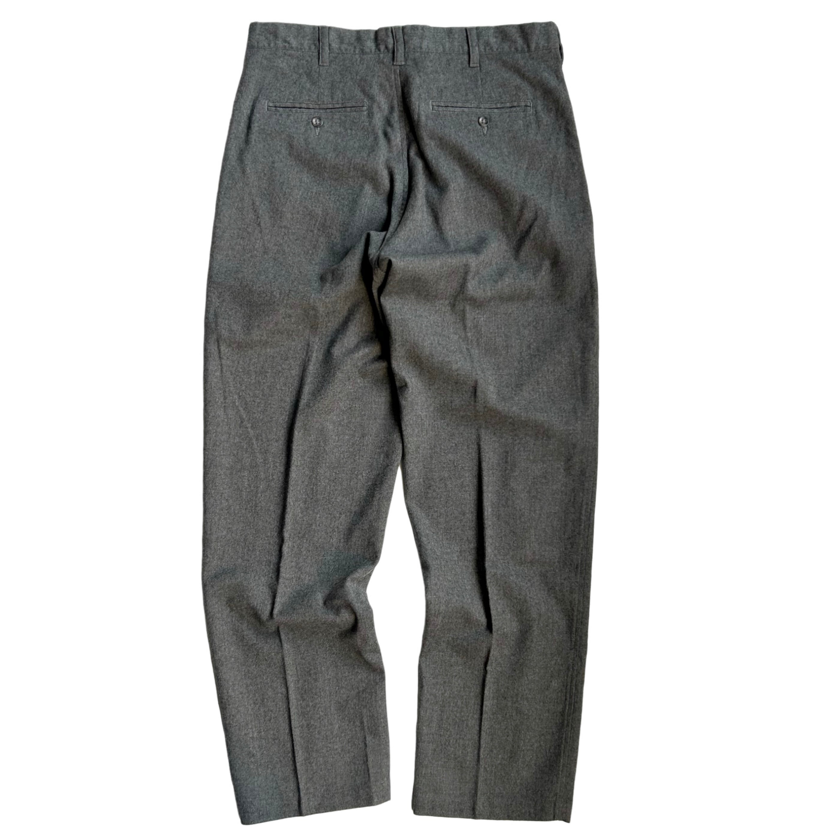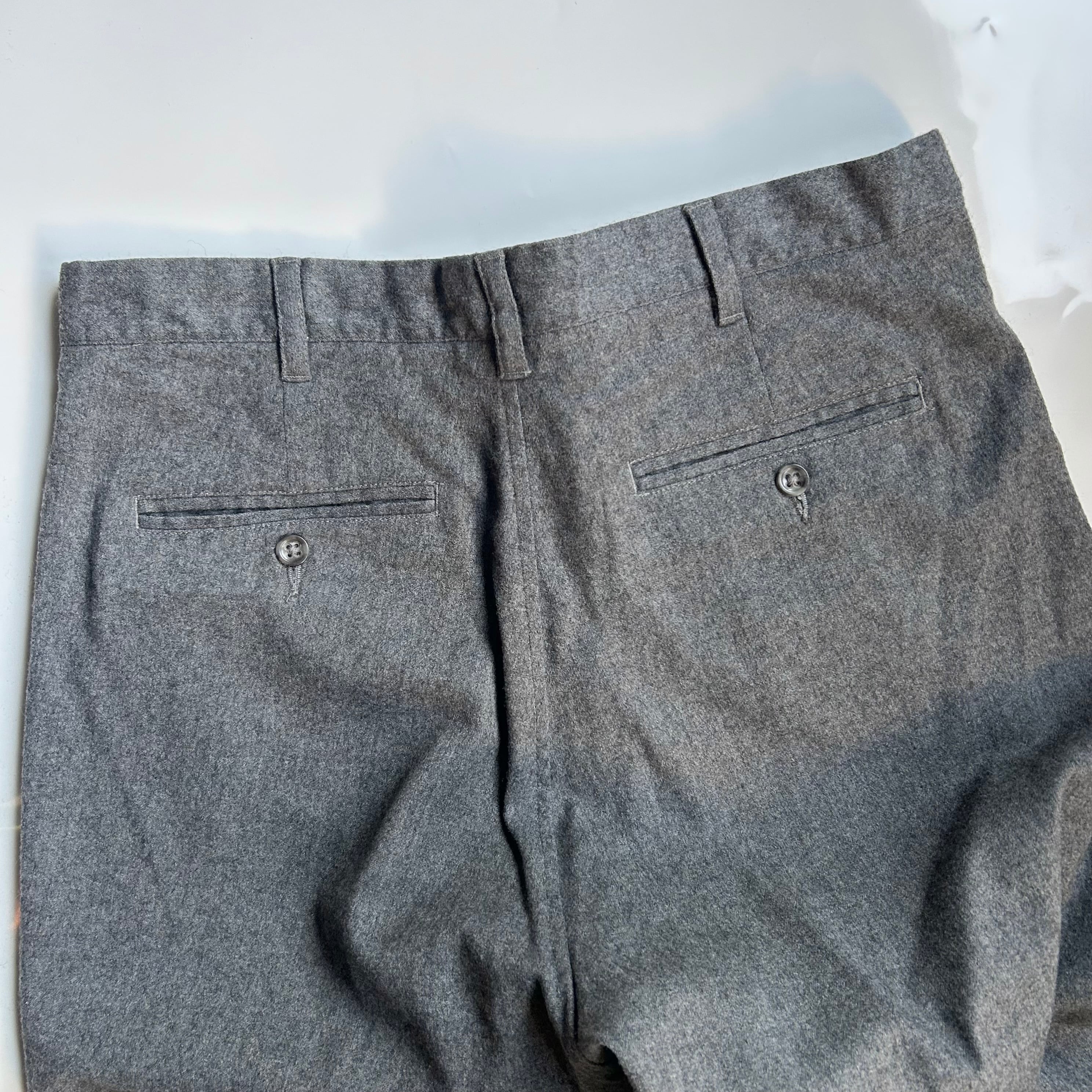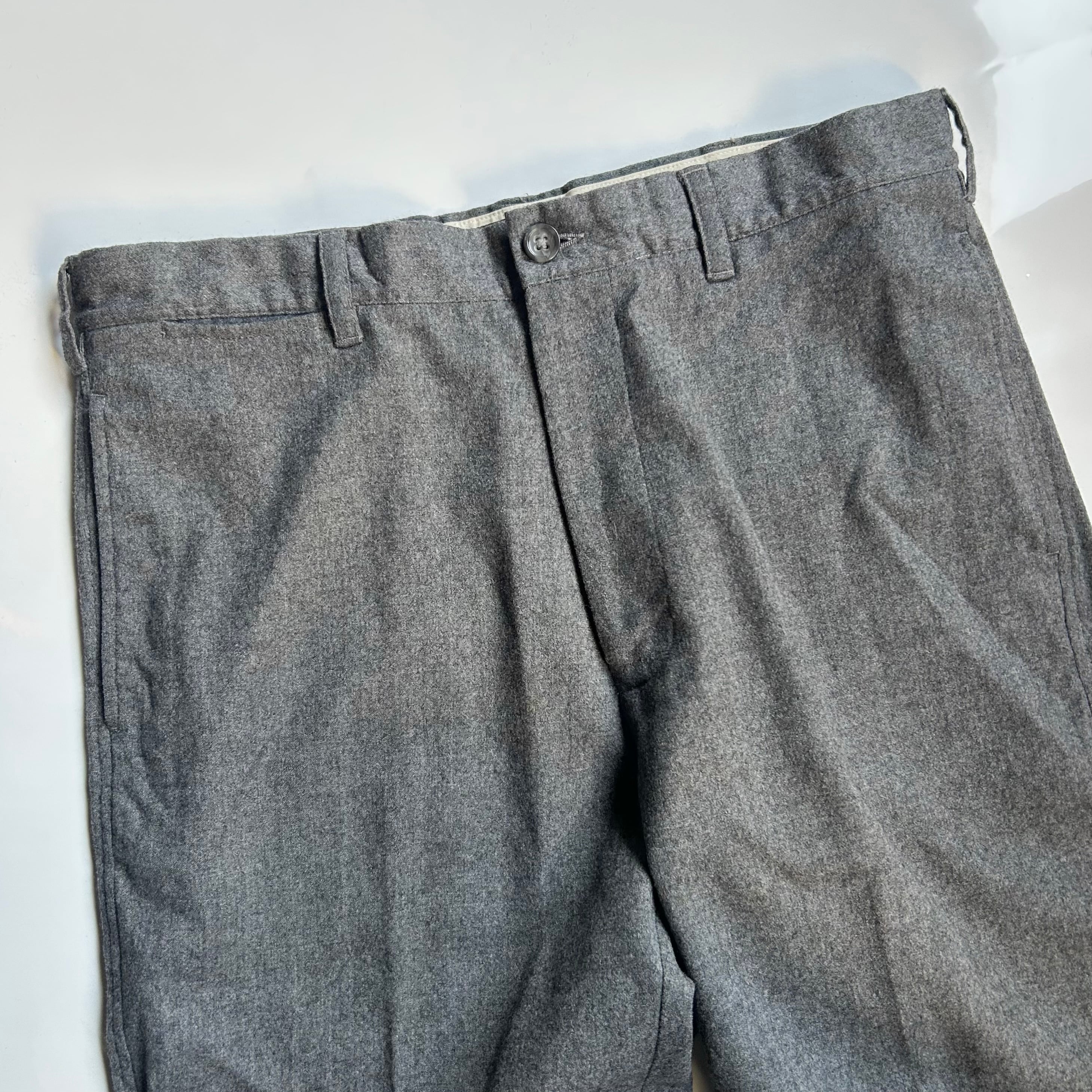 •SIZE W34L32 ウエスト 90cm 股上 32cm 股下 81cm わたり 31cm 裾幅 18.5cm •MATERIAL Wool97% Spandex •COLOR グレー •CONDITION チャック付近にシミあり 写真参照 ya6354