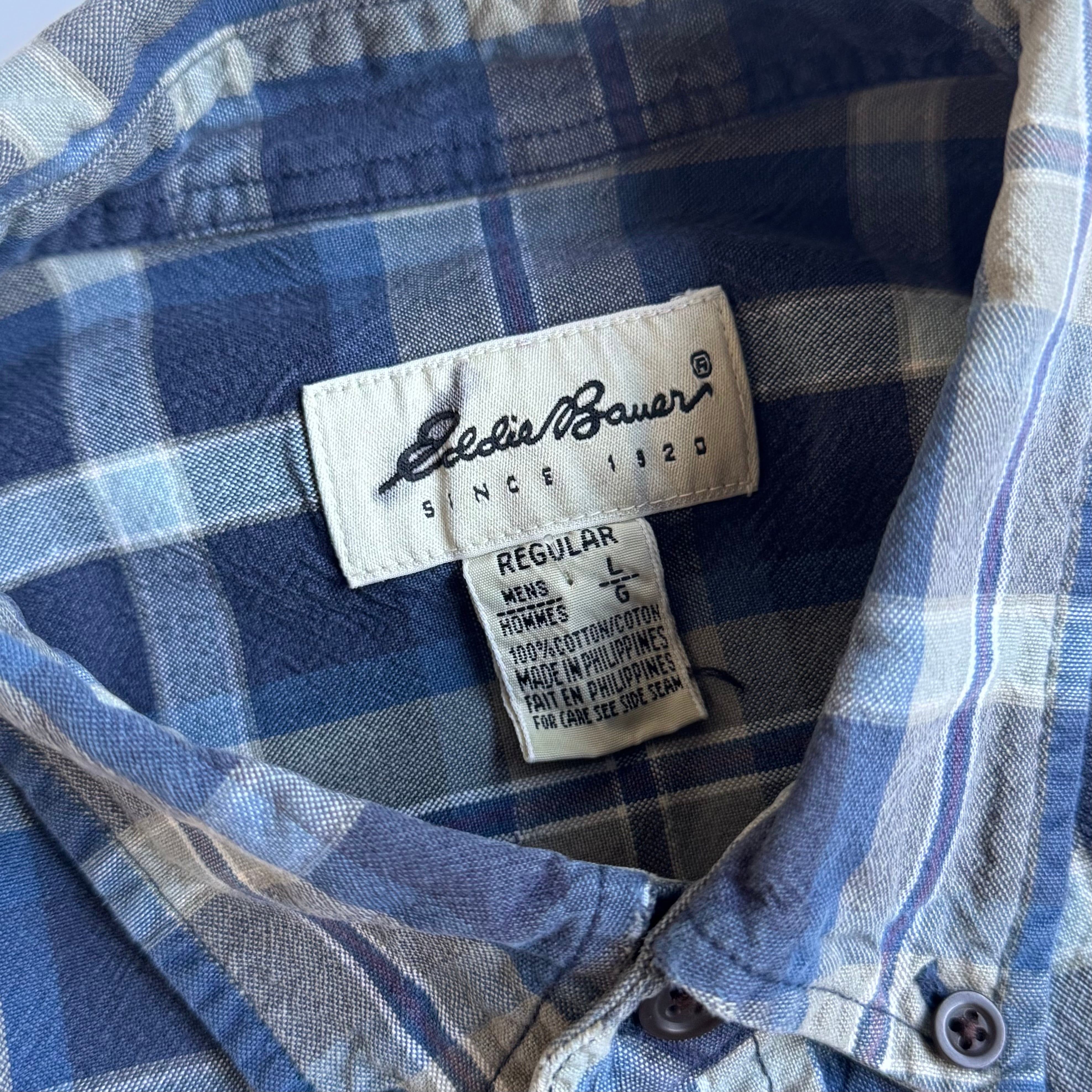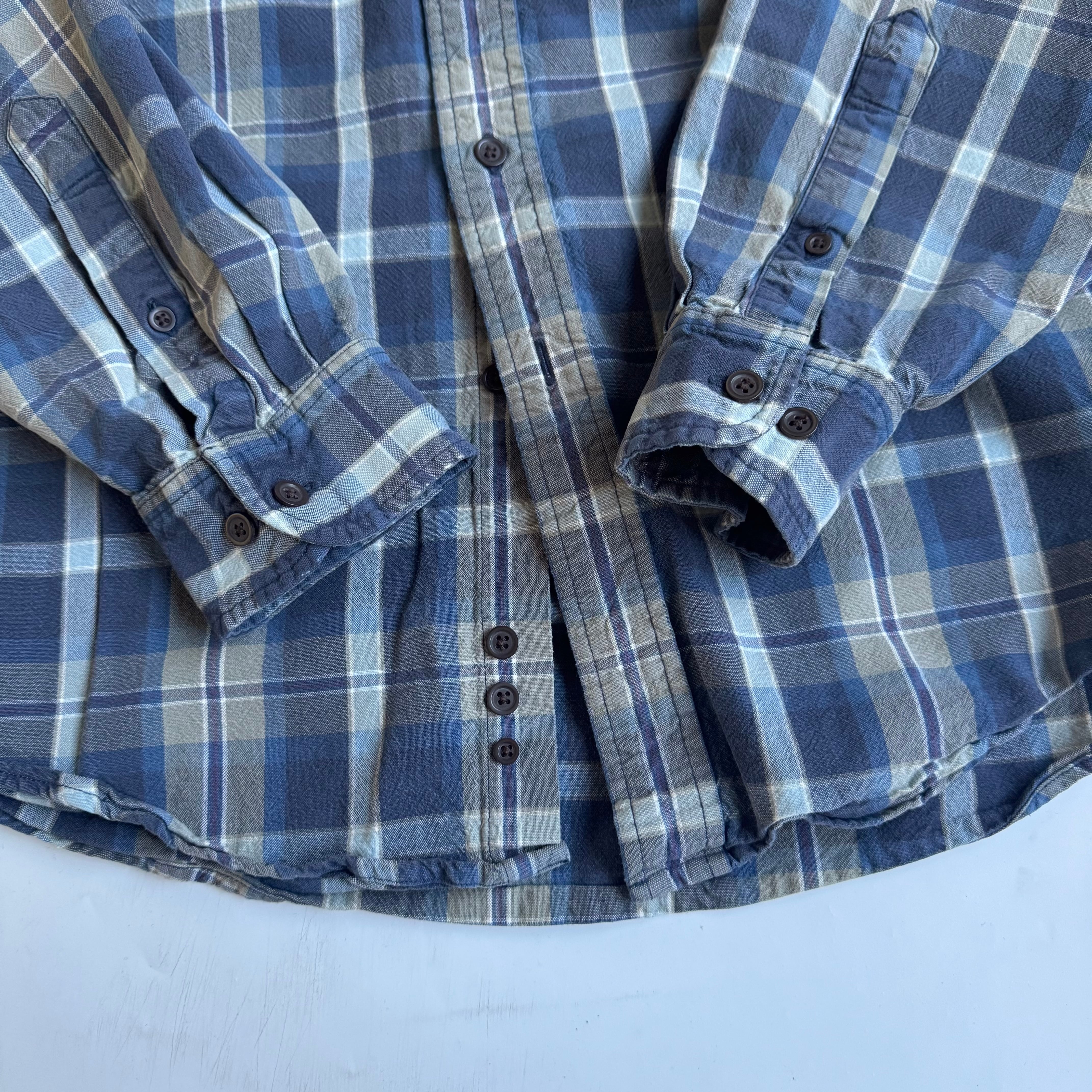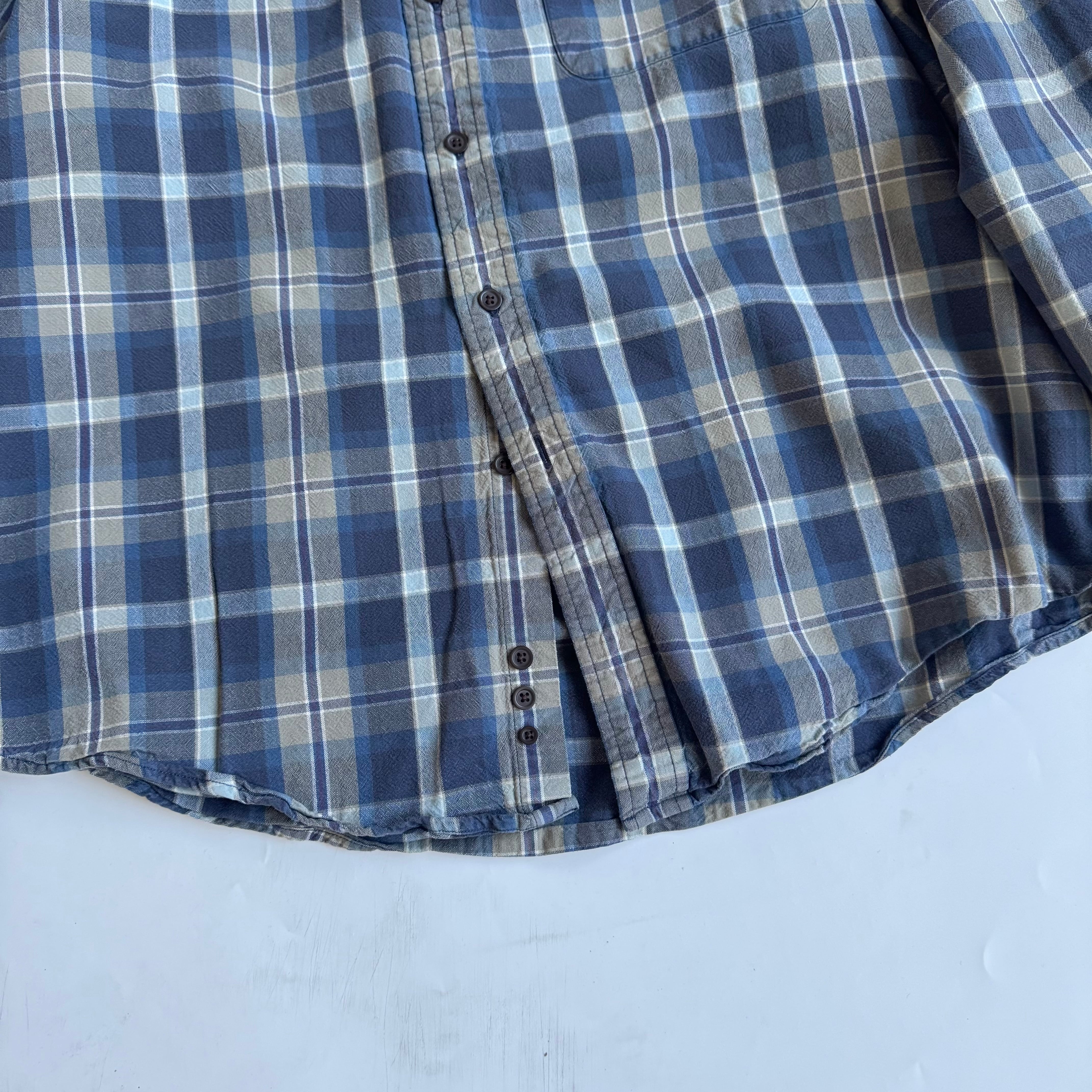 •SIZE L 肩幅 53cm 袖丈 58cm 身幅 64cm 着丈 79cm 175cm着用 175cm着用 •MATERIAL COTTON 100% •COLOR ネイビー ブルー ホワイト サンドベージュ系 •CONDITION 使用感、左肩あたりに小さなほつれ。 写真にてご確認下さい。