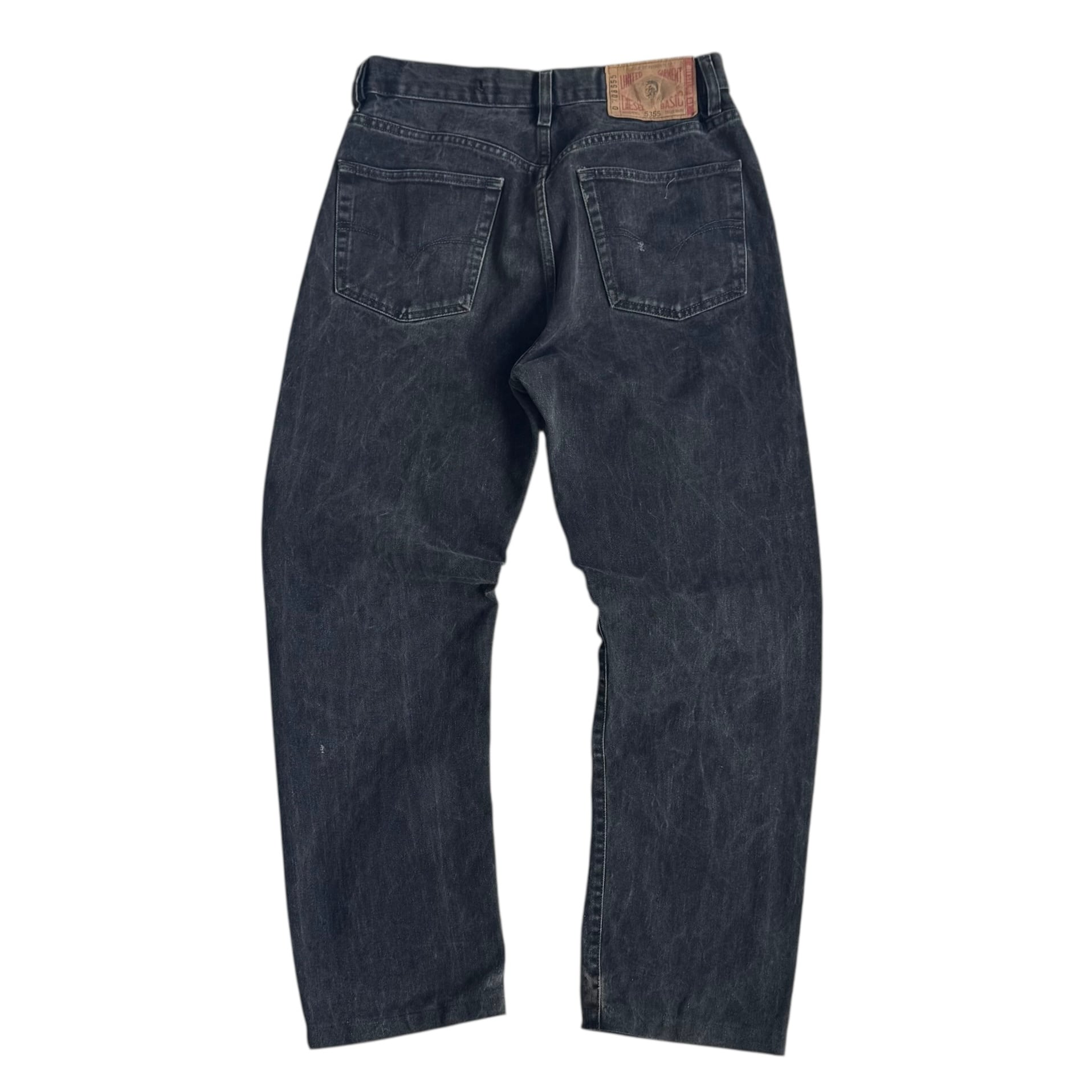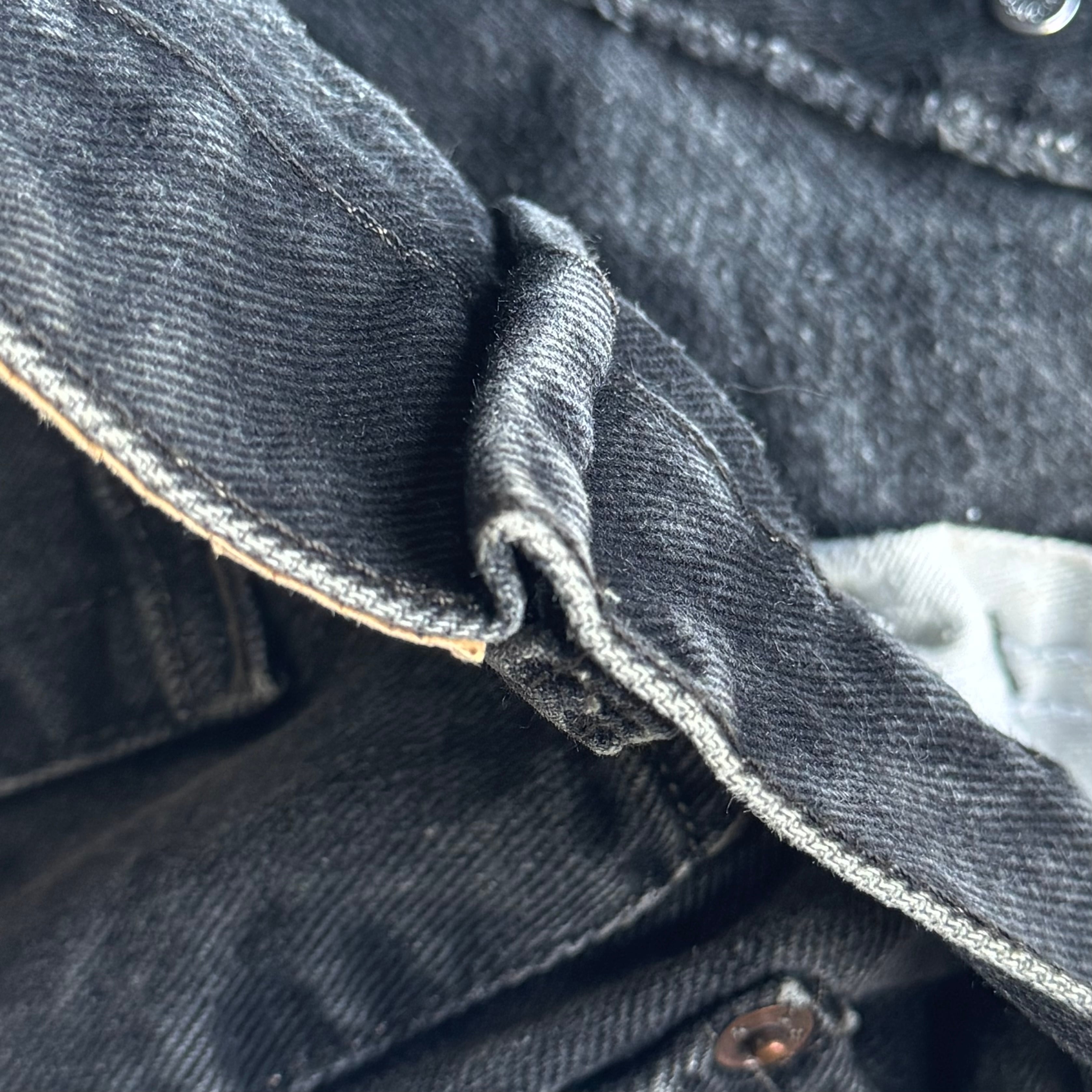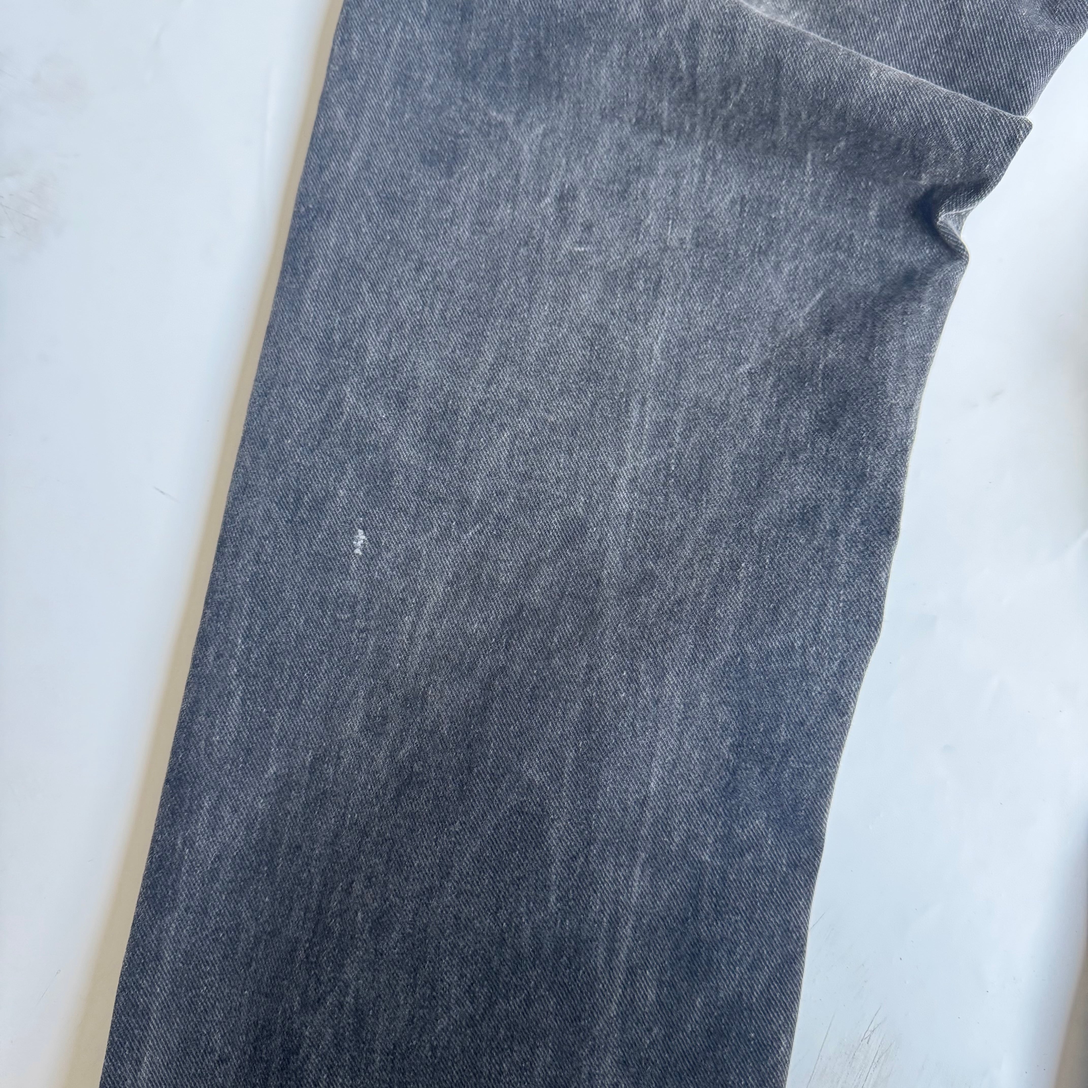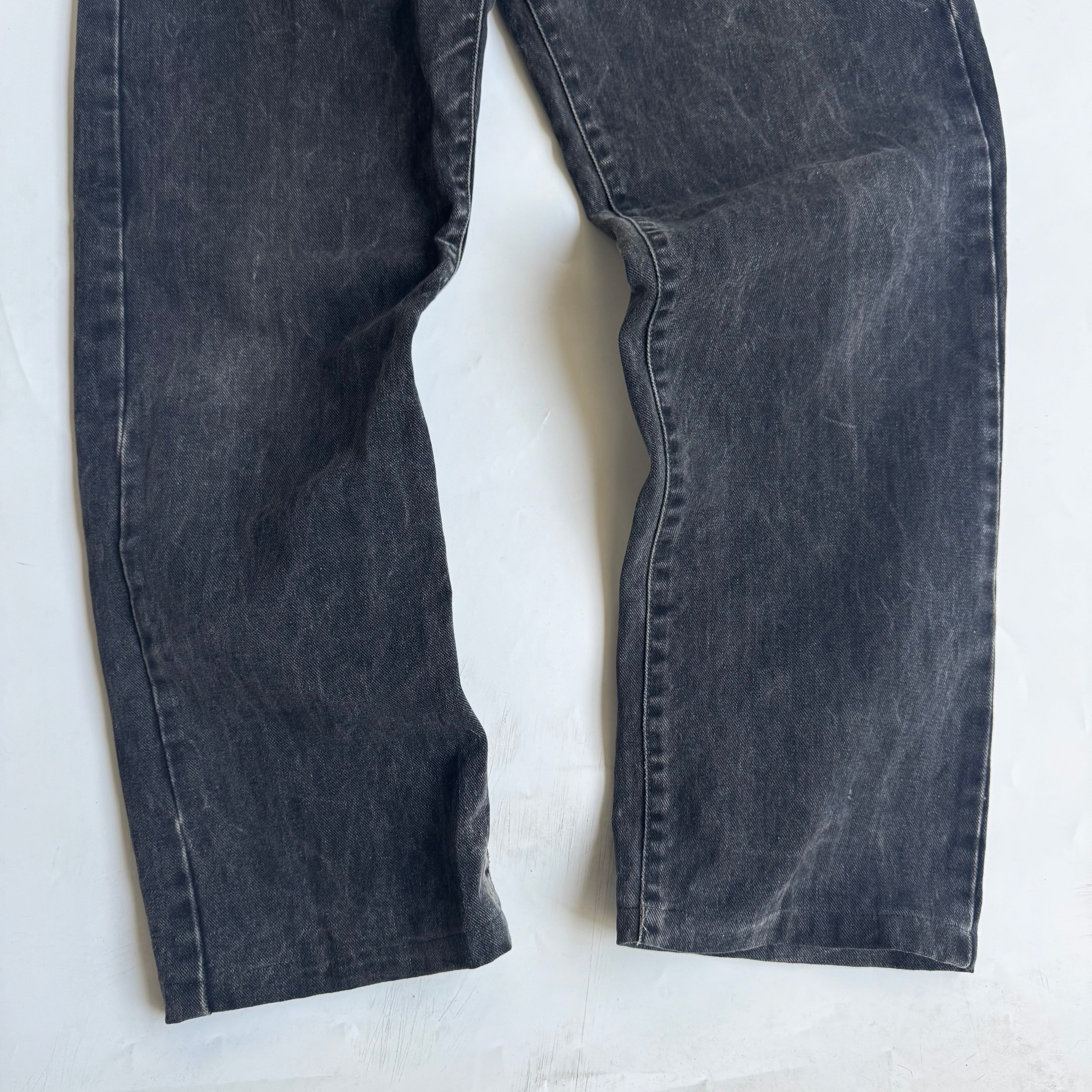 •SIZE 32 ウエスト 82cm 股上 29cm 股下 73.5cm わたり 30cm 裾幅 21.5cm •MATERIAL COTTON 100% •COLOR ブラック •CONDITION 使用感、背面に小さなダメージ、丈詰め痕、ウエスト詰め。写真にてご確認下さい。