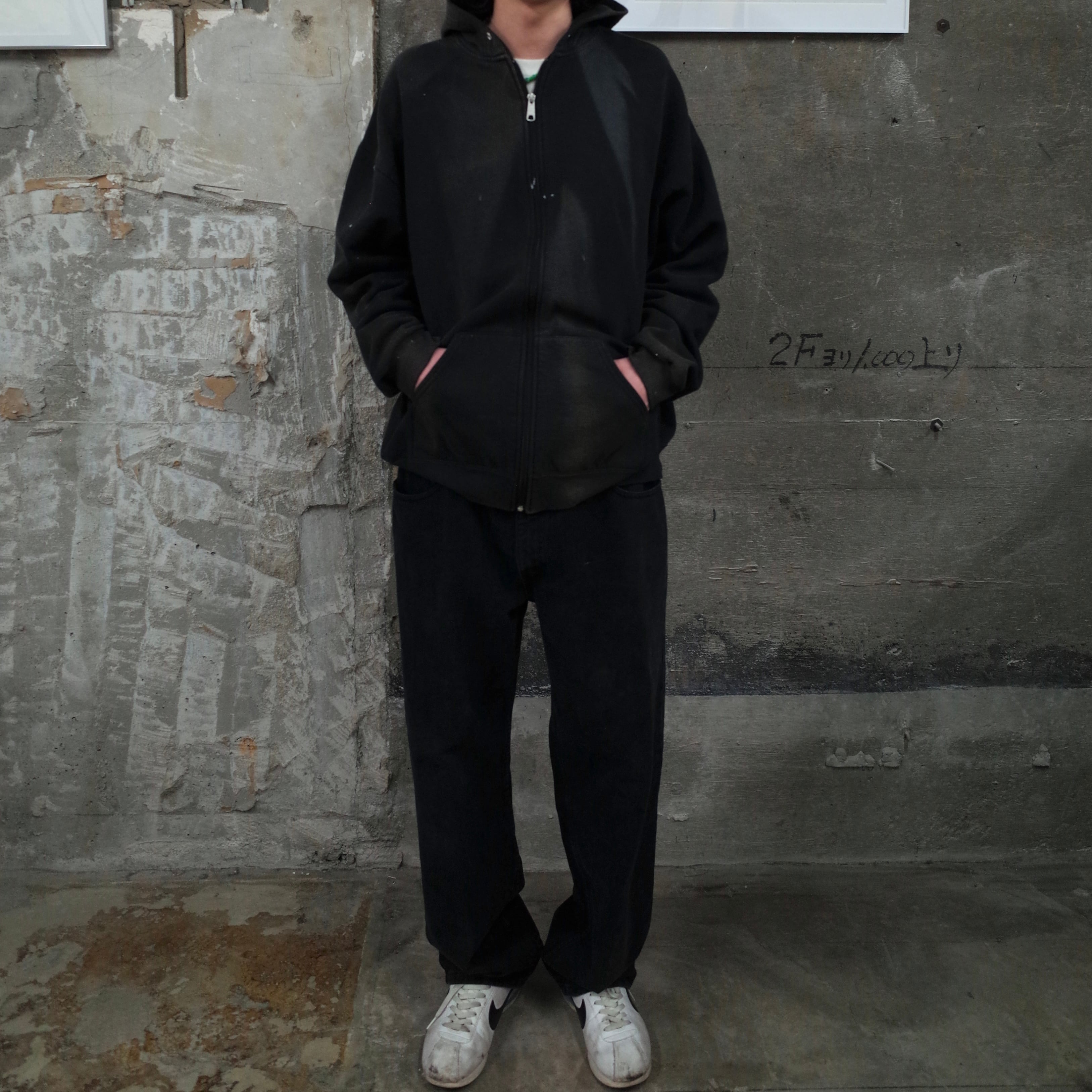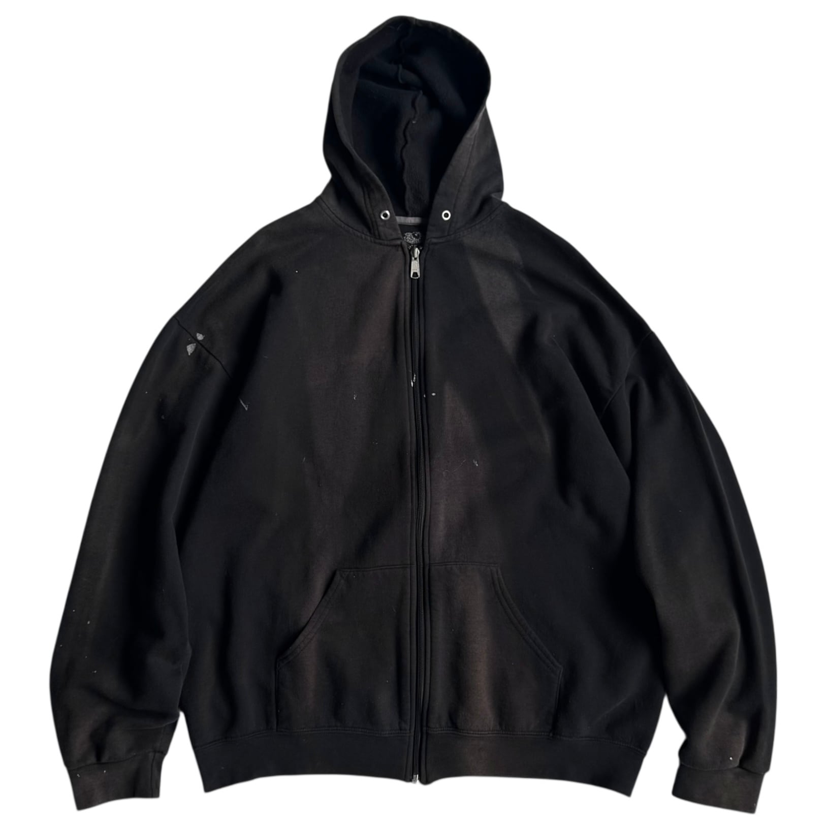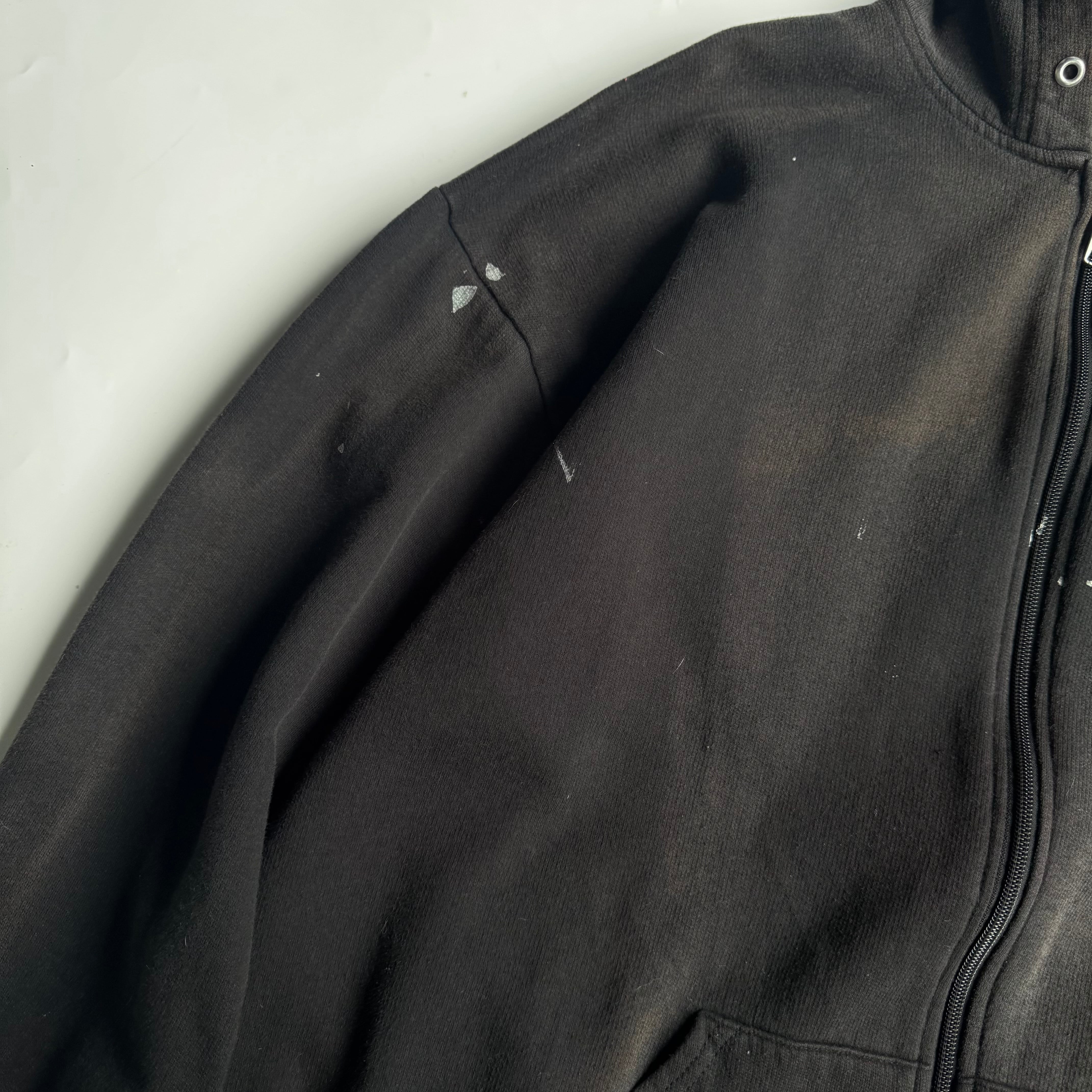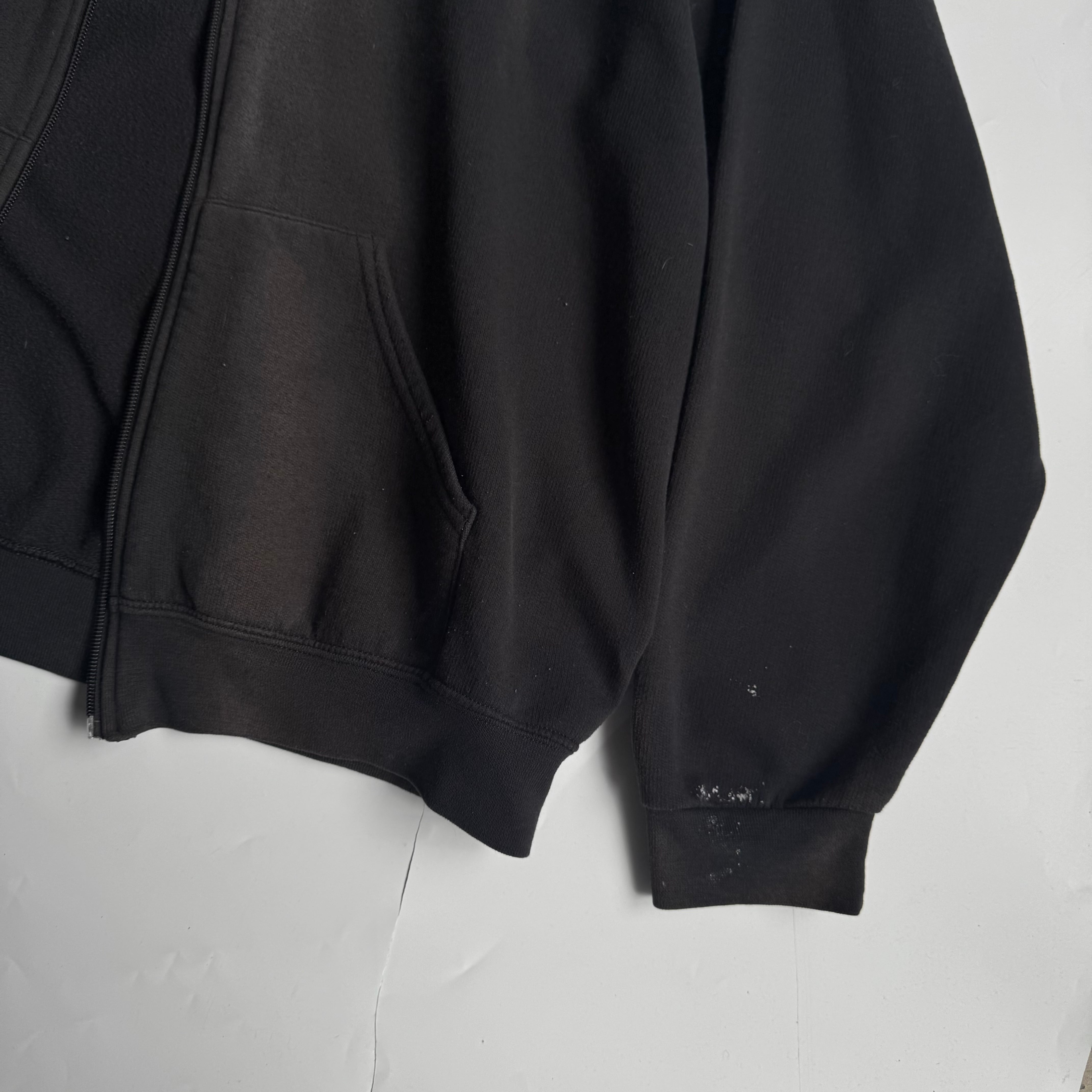古着ならでは〜な ペンキ汚れと焼け いい雰囲気です •SIZE 2XL 肩幅 66,5cm 袖丈 59cm 身幅 65cm 着丈 70cm •MATERIAL COTTON 60% POLYESTER 40% •COLOR ブラック •CONDITION 使用感、ペンキ汚れ、脱色痕。 いい雰囲気です。 kt608