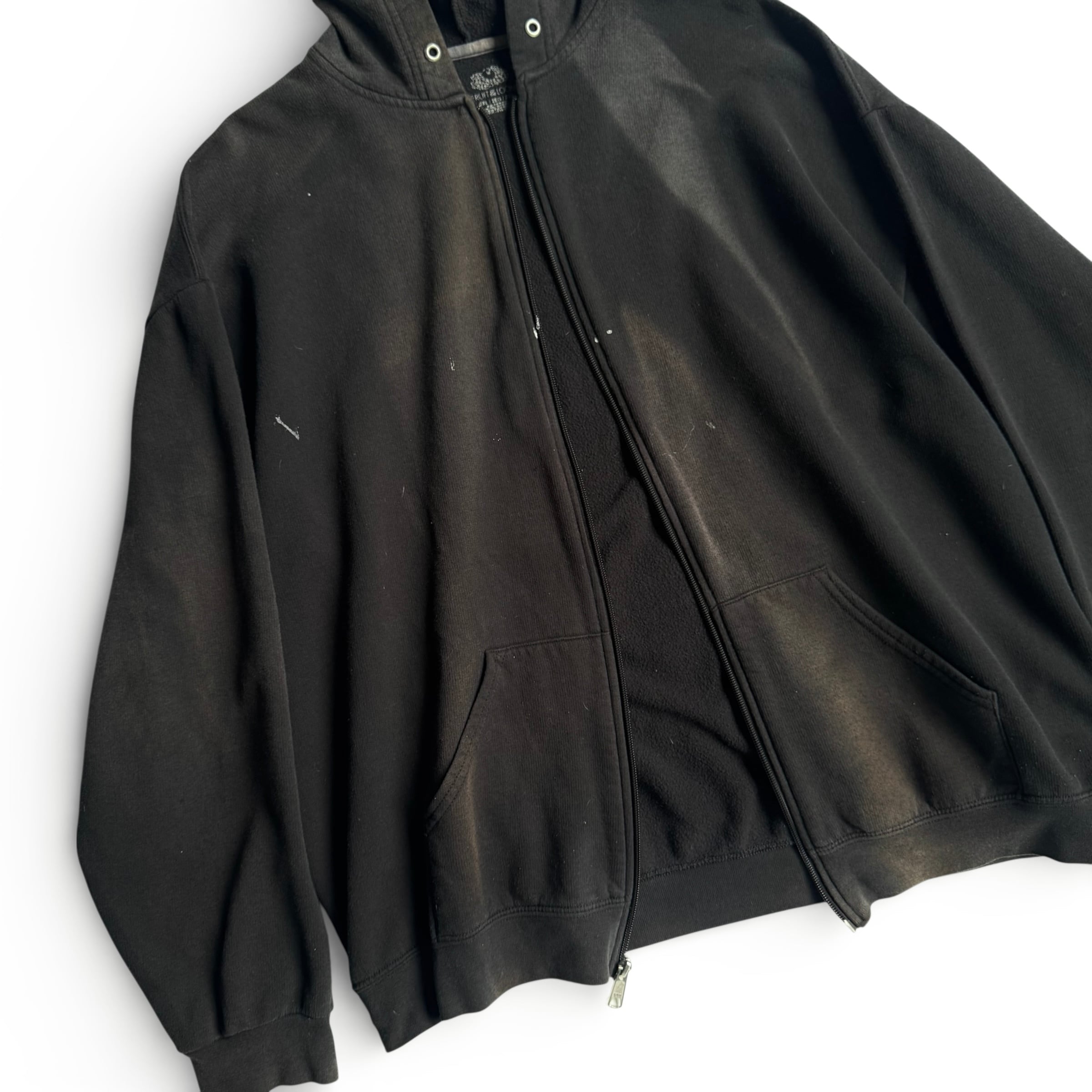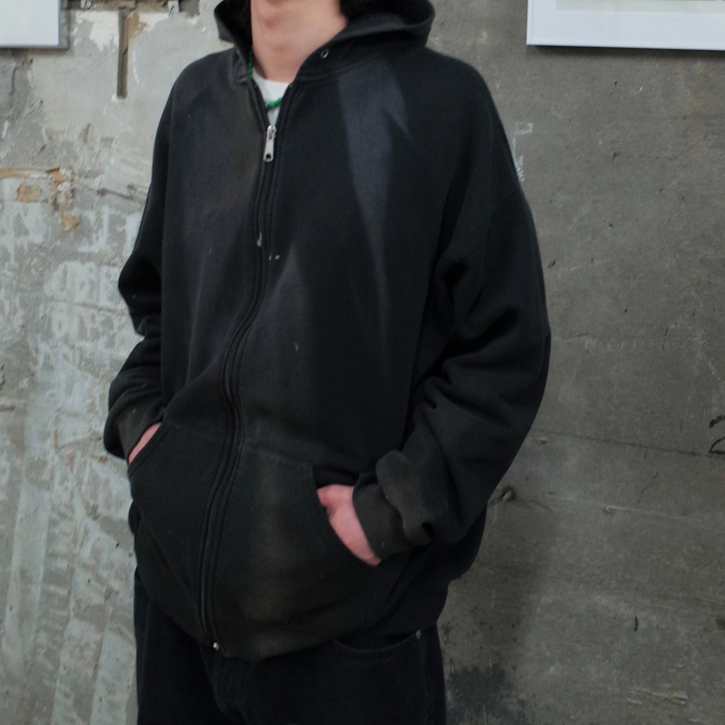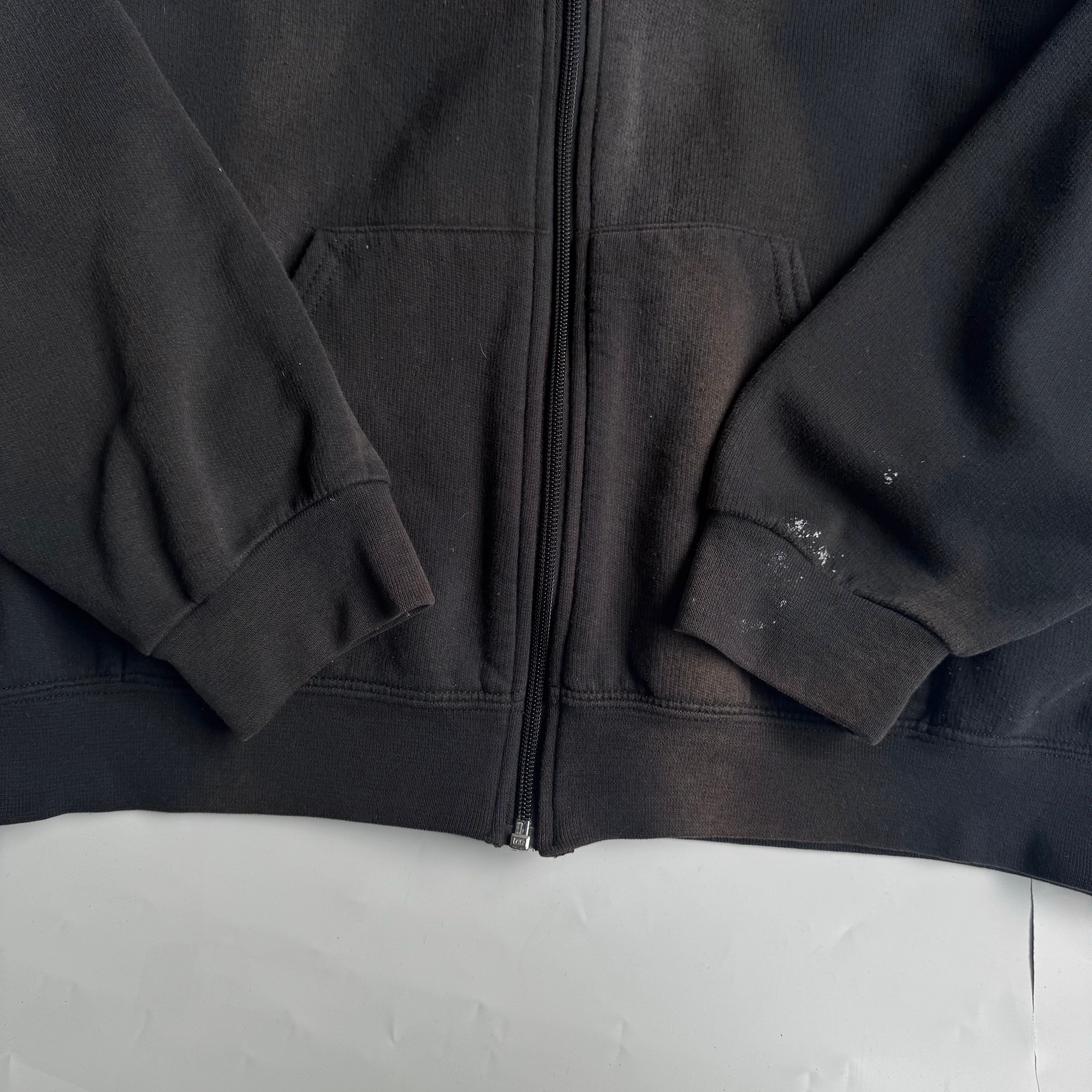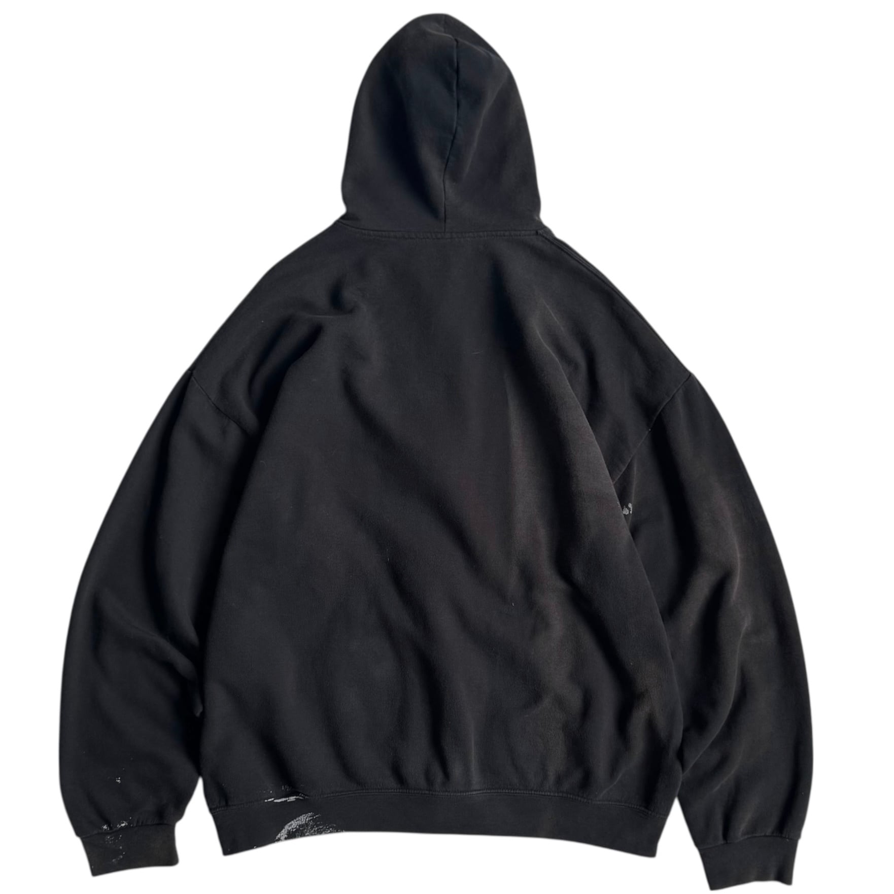 古着ならでは〜な ペンキ汚れと焼け いい雰囲気です •SIZE 2XL 肩幅 66,5cm 袖丈 59cm 身幅 65cm 着丈 70cm •MATERIAL COTTON 60% POLYESTER 40% •COLOR ブラック •CONDITION 使用感、ペンキ汚れ、脱色痕。 いい雰囲気です。 kt608