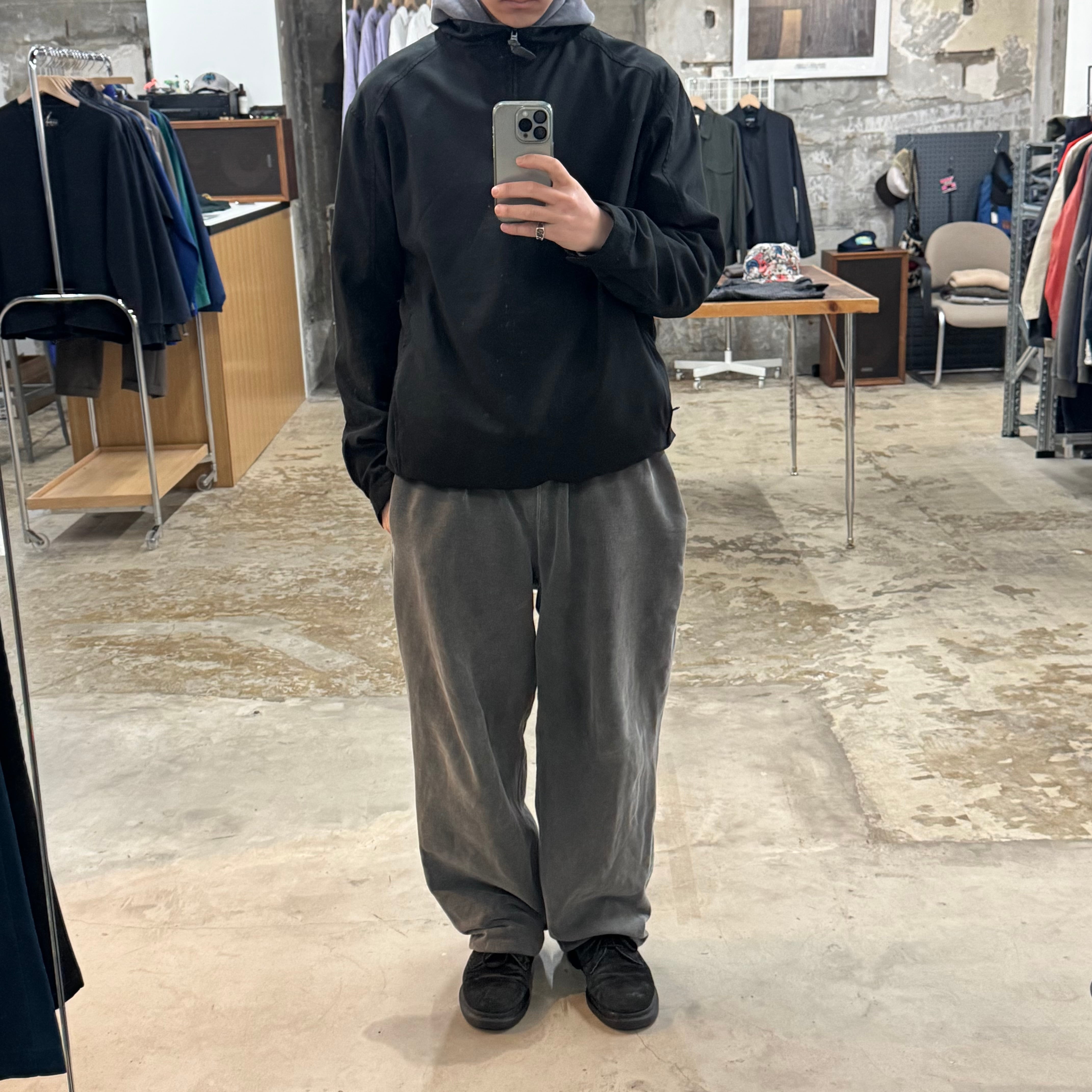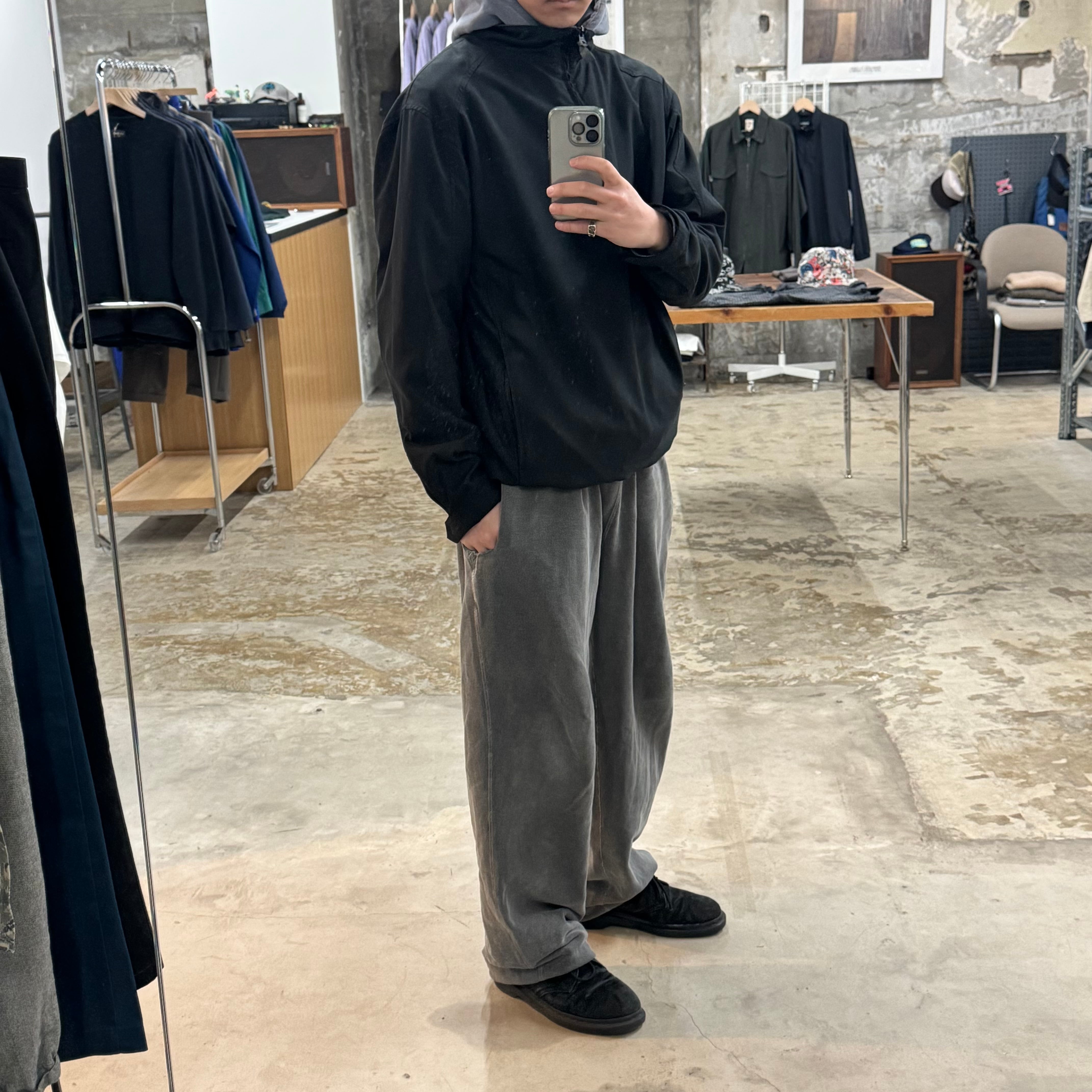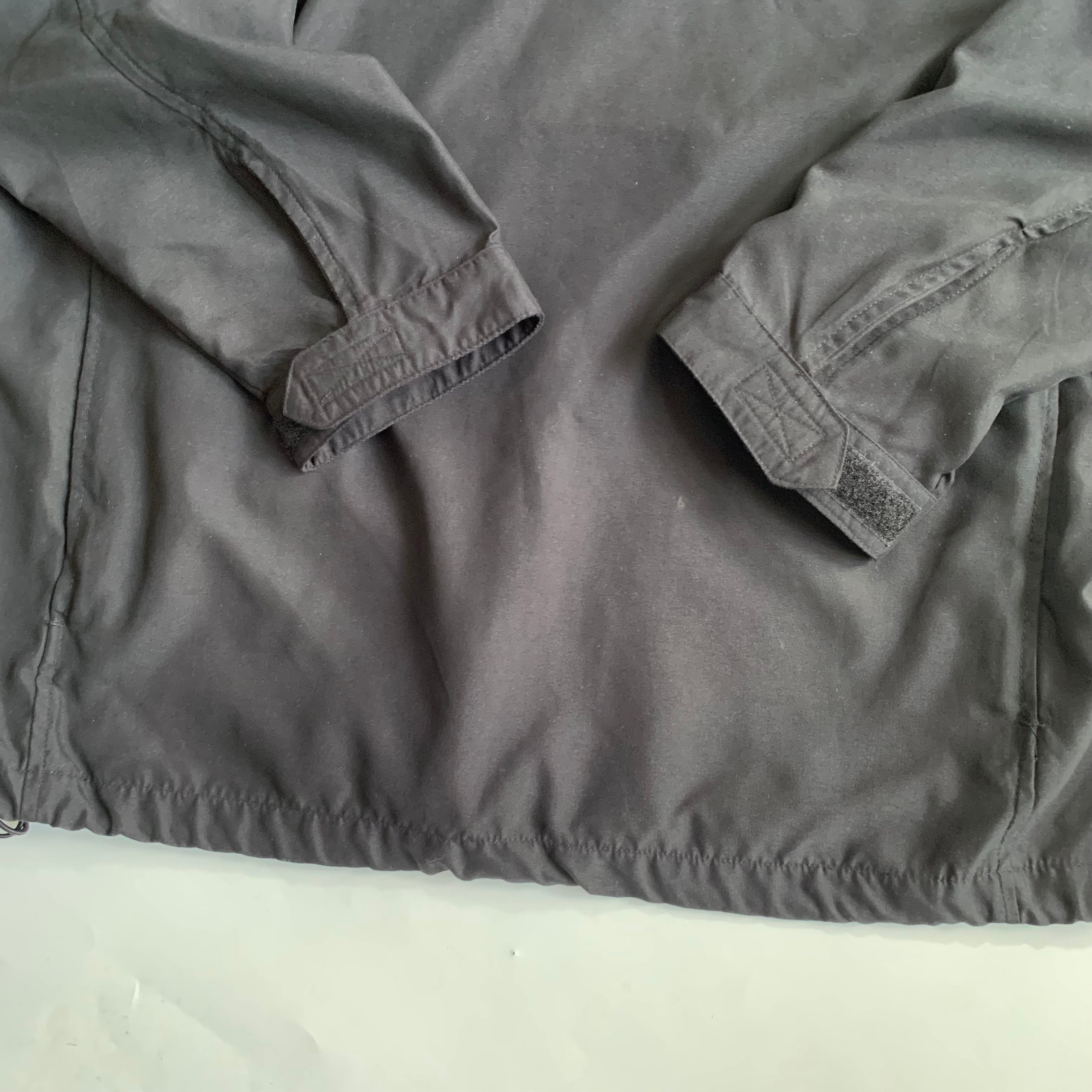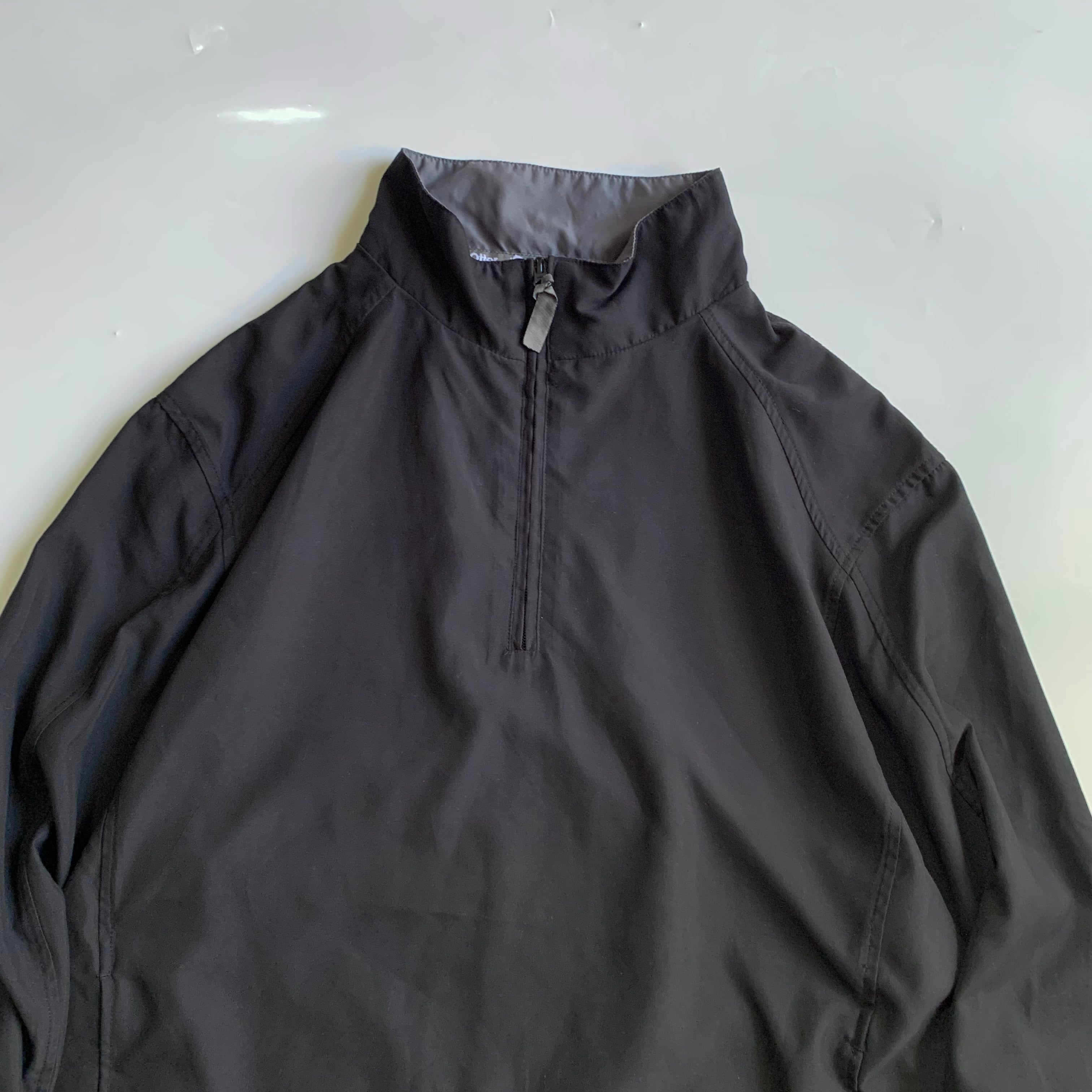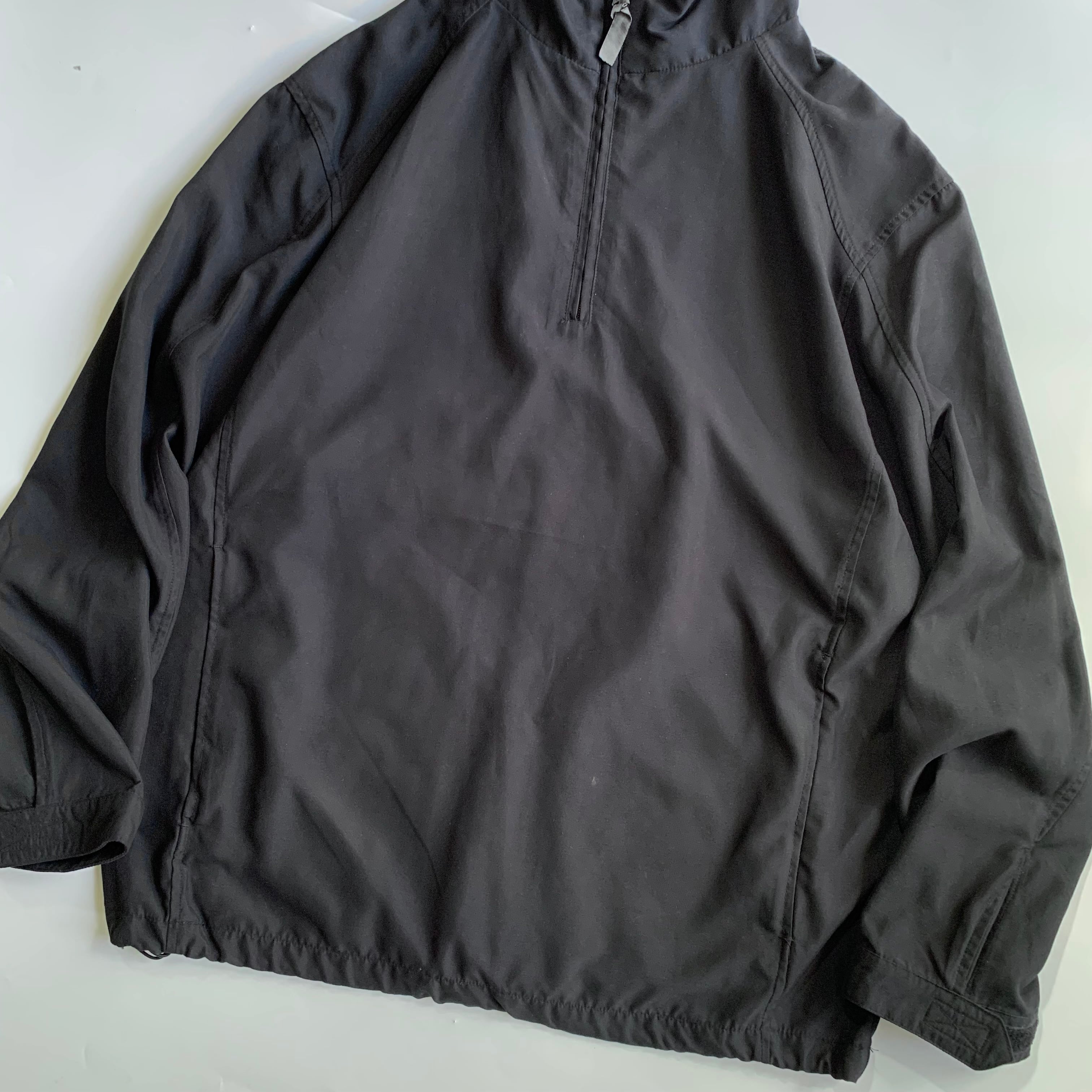 シンプルなプルオーバージャケット。 ネック広めで着やすい形。 •SIZE M 肩幅 53cm 袖丈 61cm 身幅 61cm 着丈 72cm 175cm着用 •MATERIAL POLYESTER 100% •COLOR ブラック •CONDITION フロントに薄汚れあり。 写真にてご確認下さい。 f517