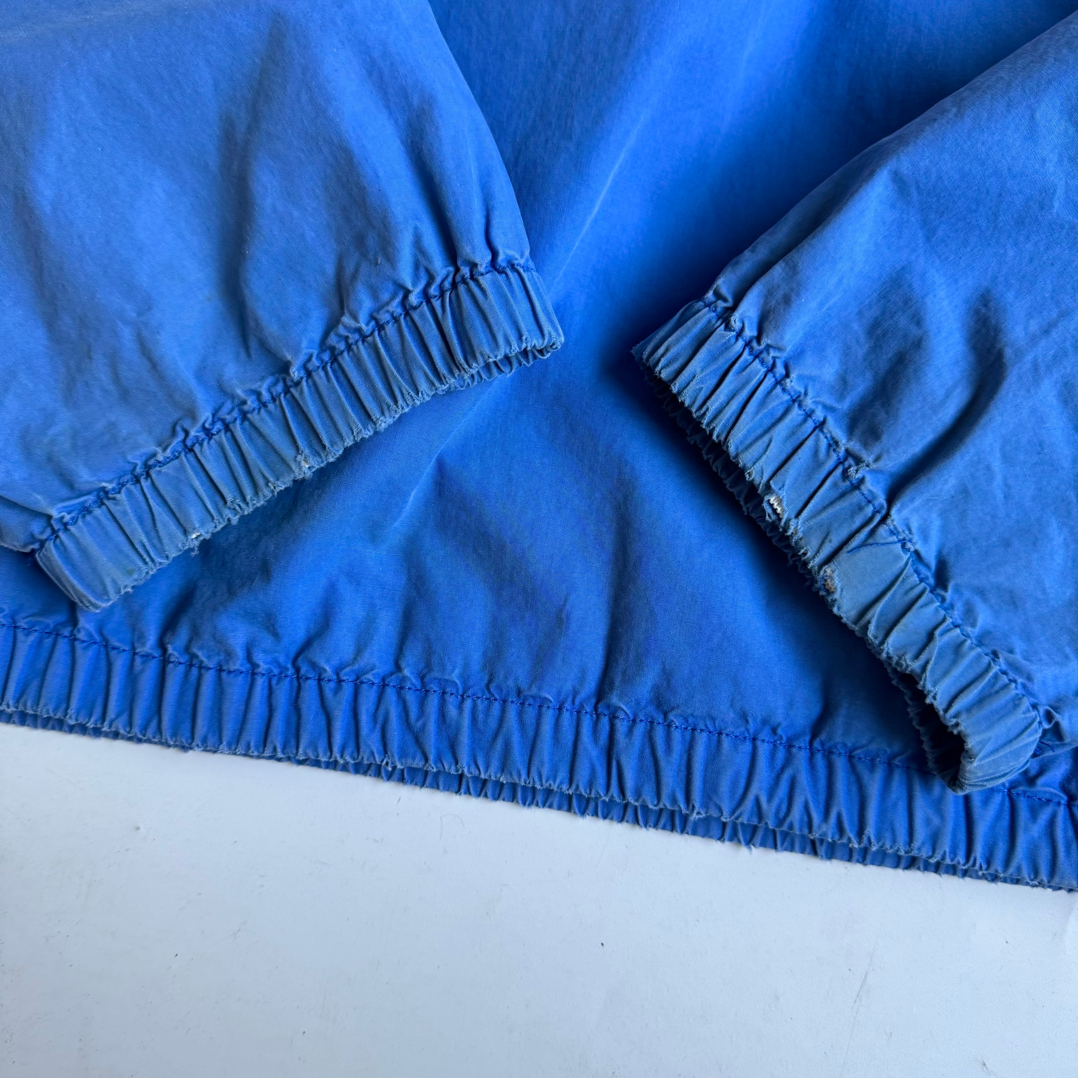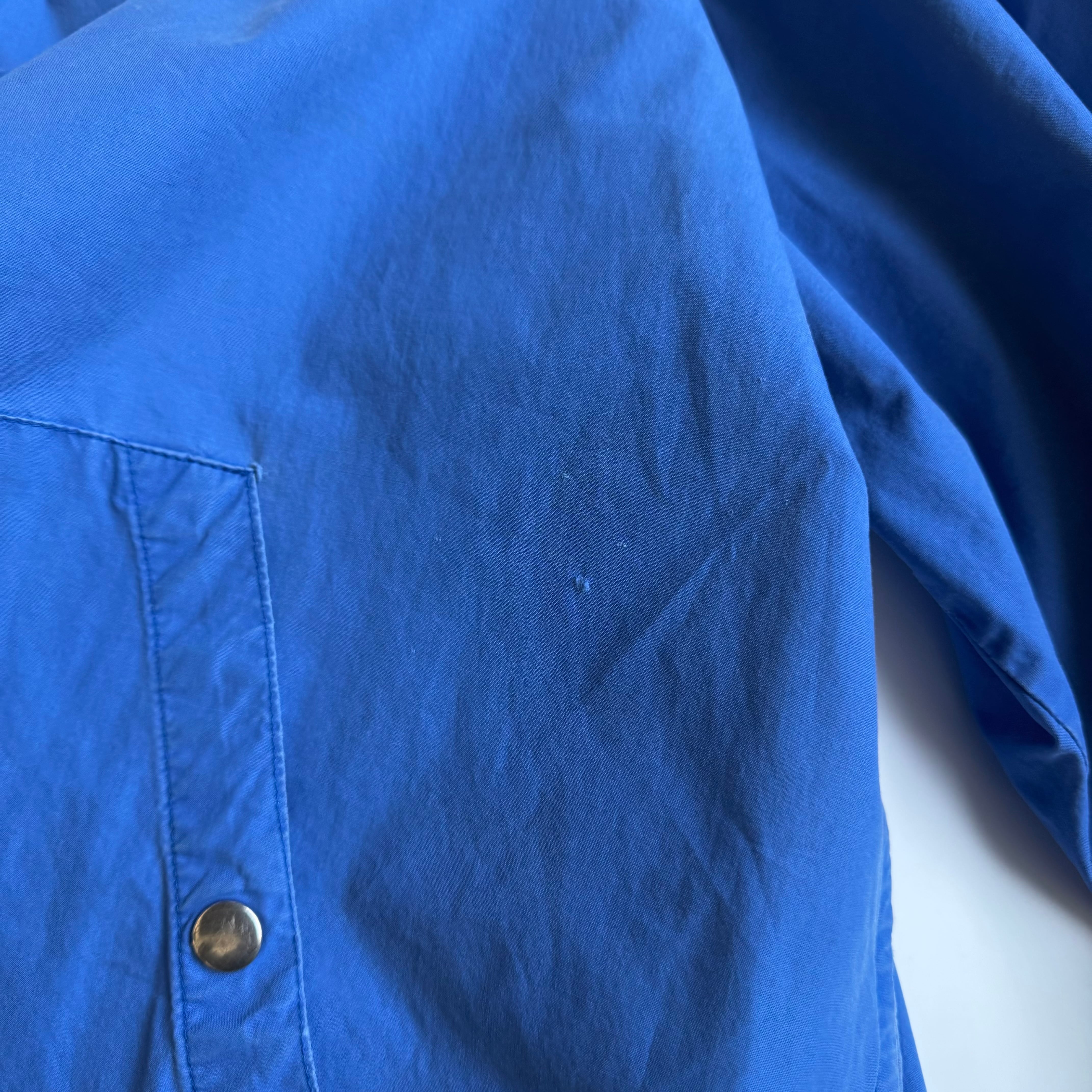 ヴィンテージライクな コンパクトな形とディテール◎ 気分なカラー •SIZE M 肩幅 54cm 袖丈 64cm 身幅 66cm 着丈 64cm 180cm着用 •MATERIAL COTTON 100% •COLOR ブルー •CONDITION 全体的に使用感、アタリ、袖口にダメージ、背タグにカスレ。写真にてご確認ください。 1139