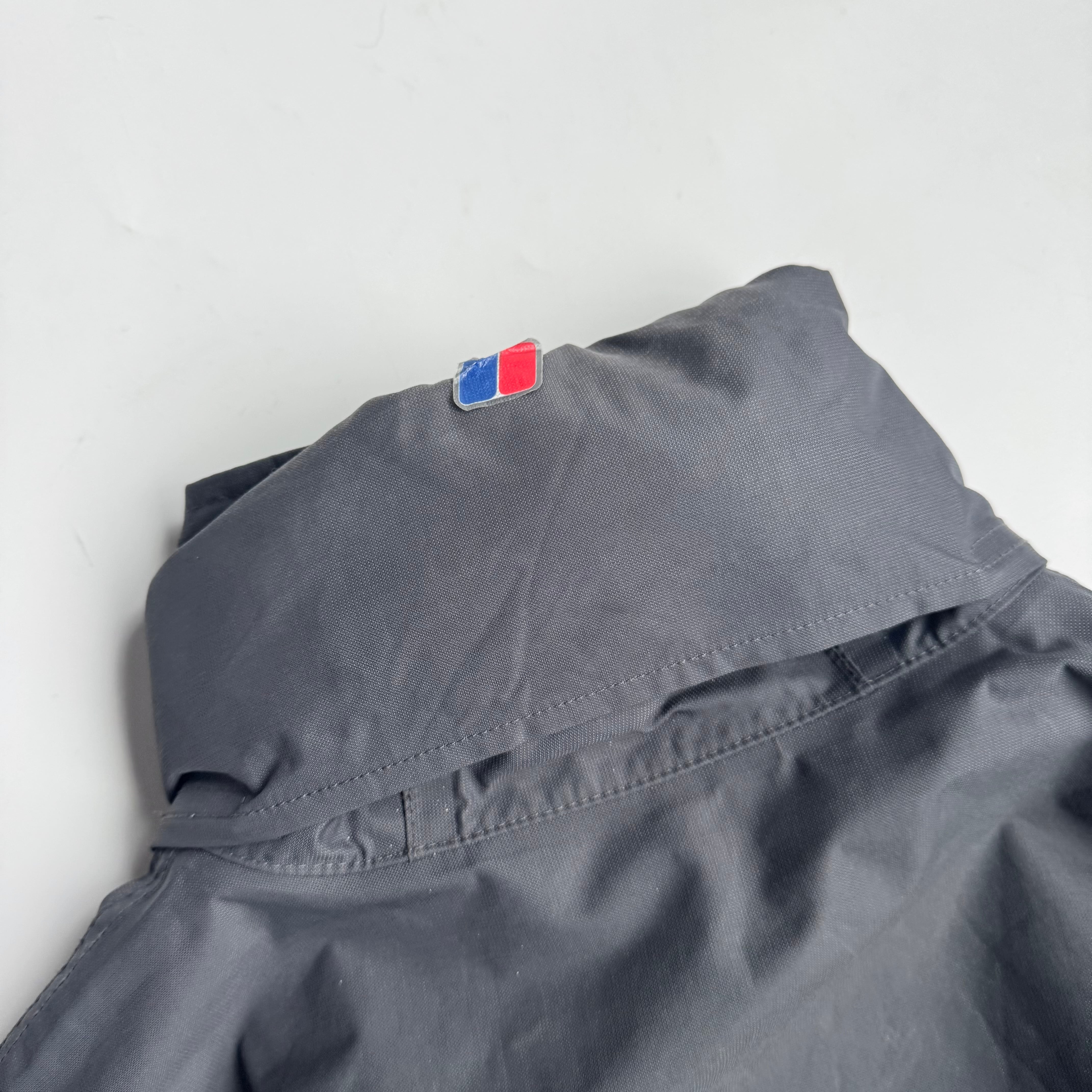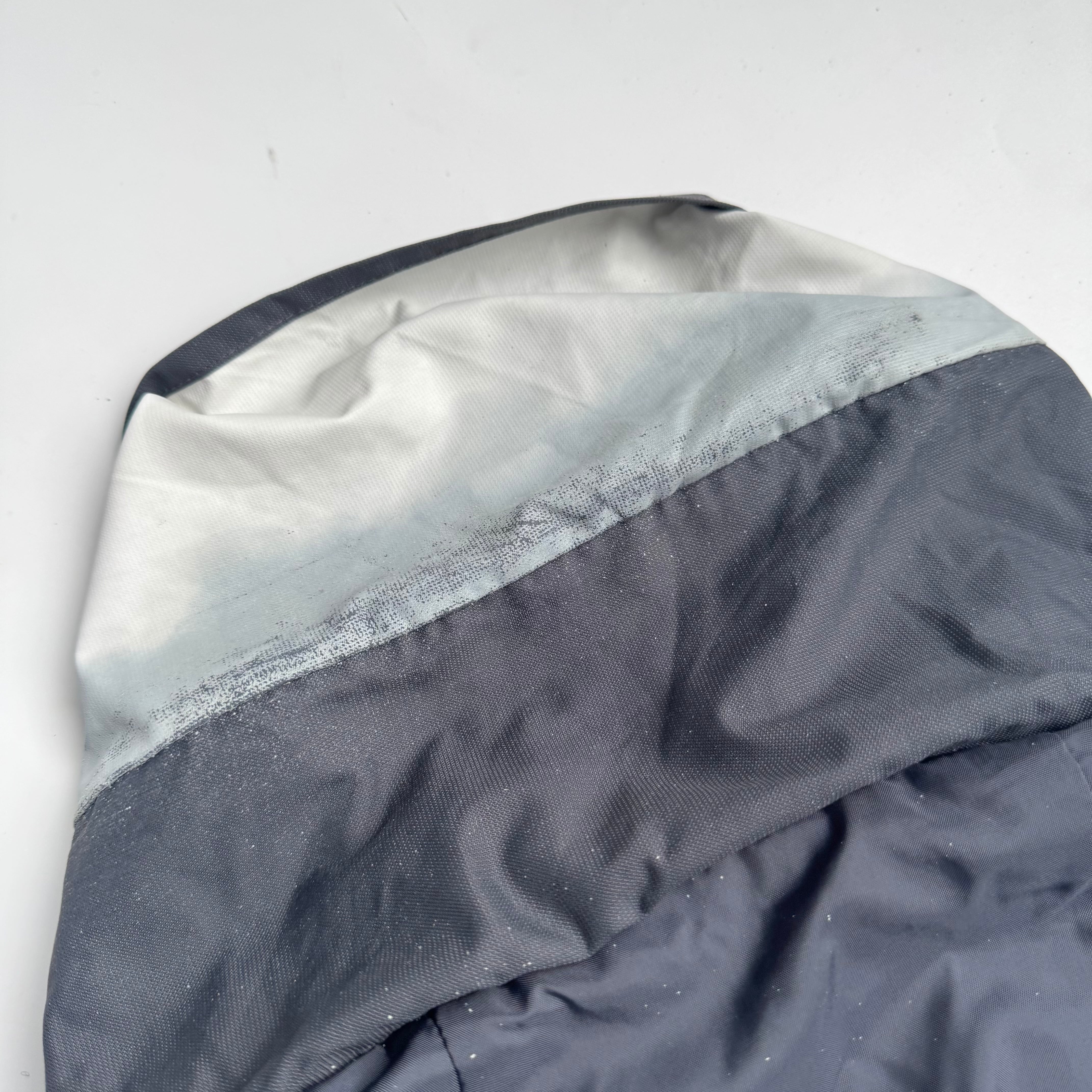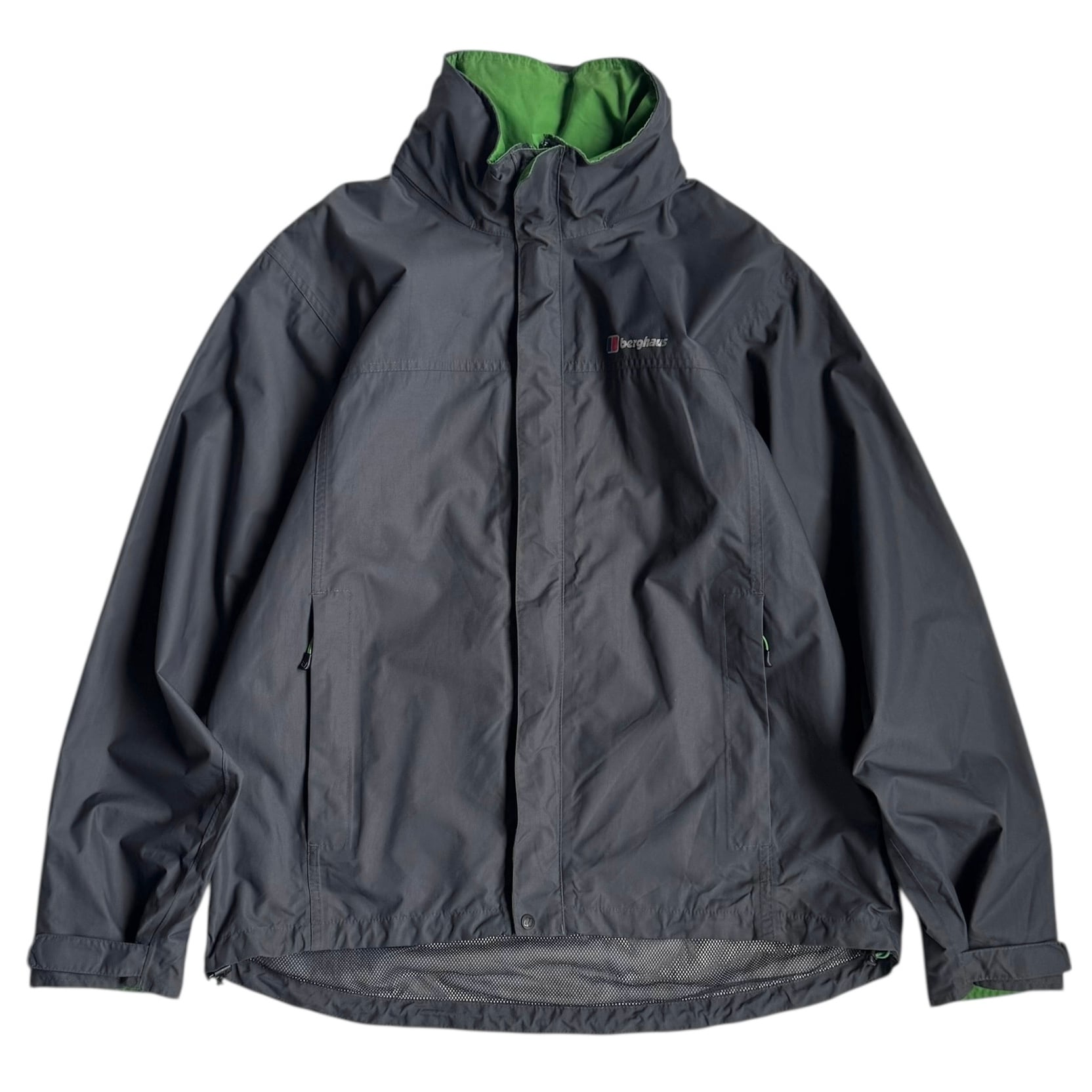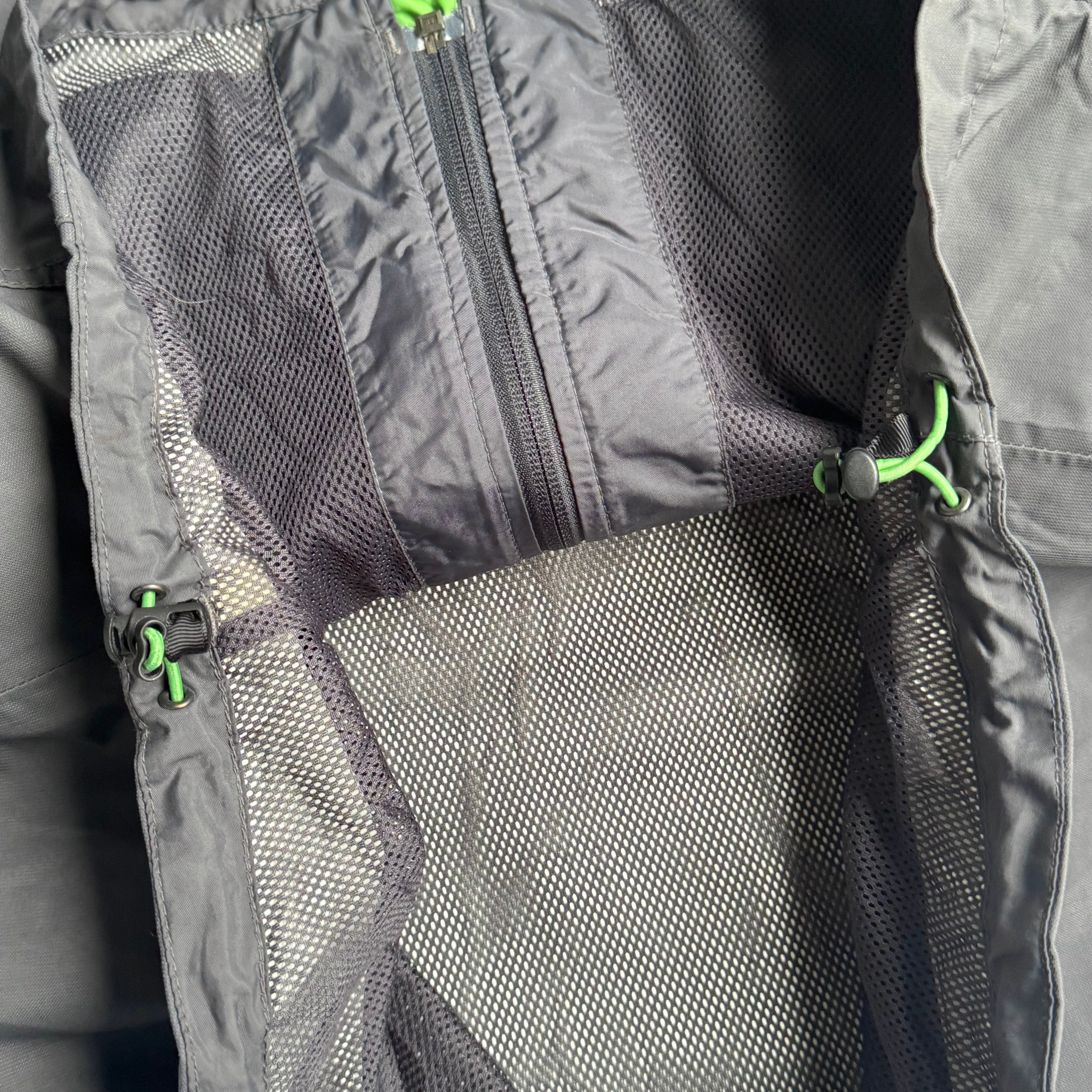 ネックと比翼部分裏の グリーンがいいアクセント◎ •SIZE L 肩幅 51cm 袖丈 62cm 身幅 62cm 着丈 78cm 175cm着用 •MATERIAL POLYAMIDE 100% •COLOR グレー •CONDITION 使用感、背面に汚れ、背面ネックのロゴプリントに剥がれ、袖に汚れ、内側の生地は劣化はございませんが、フード収納部分の生地の裏側に劣化による粉がございます。着用に問題ございませんが、神経質な方はお控えください。 ya6377