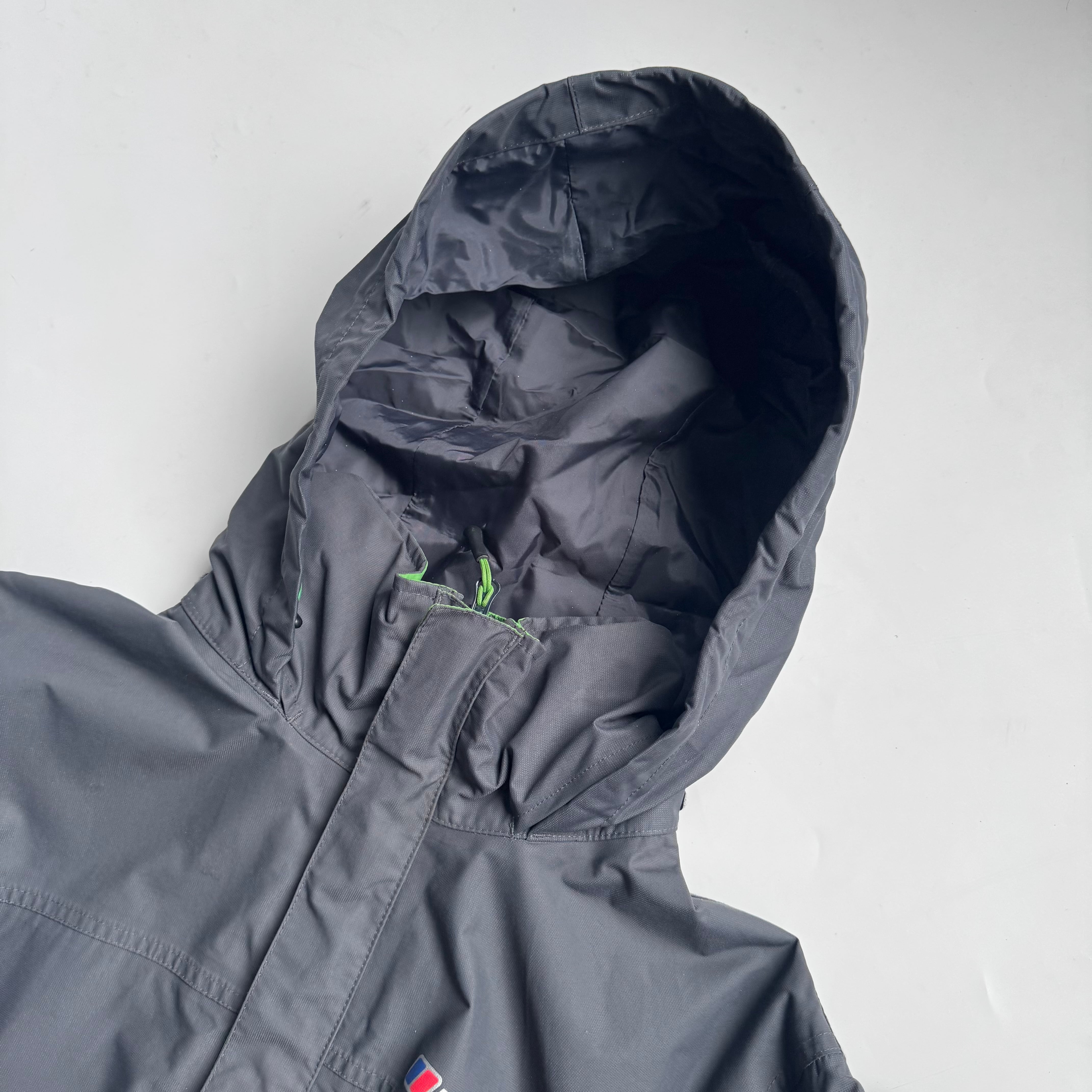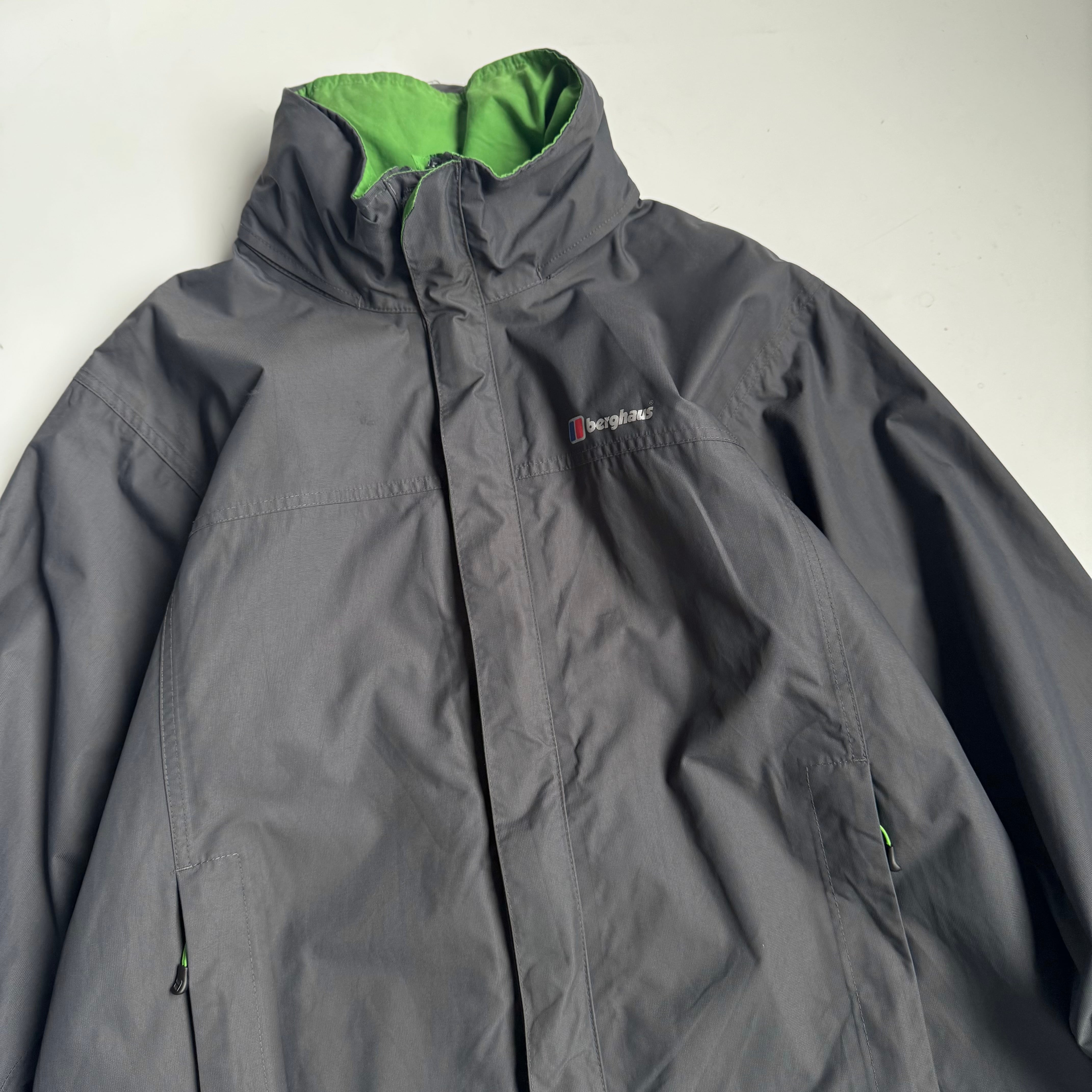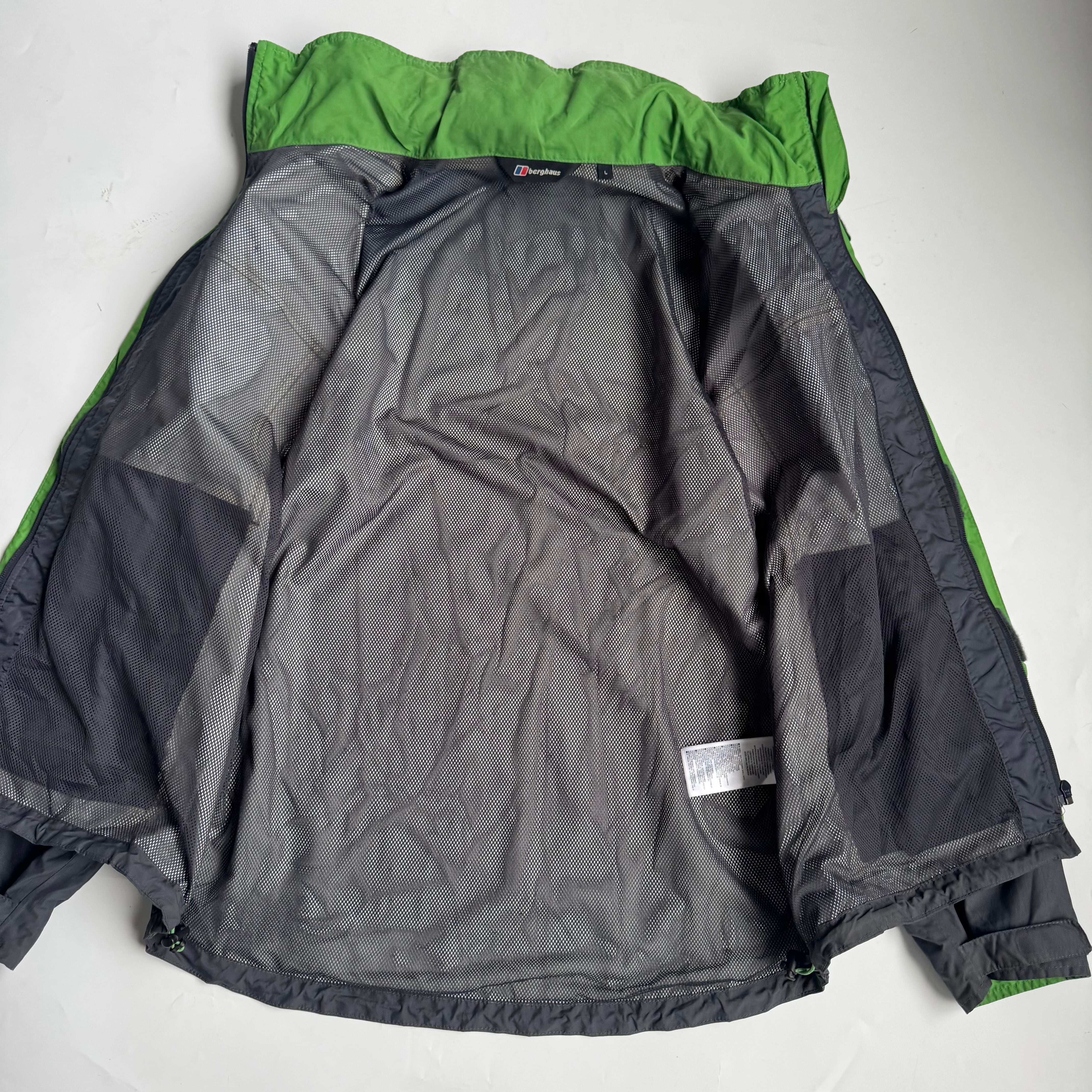 ネックと比翼部分裏の グリーンがいいアクセント◎ •SIZE L 肩幅 51cm 袖丈 62cm 身幅 62cm 着丈 78cm 175cm着用 •MATERIAL POLYAMIDE 100% •COLOR グレー •CONDITION 使用感、背面に汚れ、背面ネックのロゴプリントに剥がれ、袖に汚れ、内側の生地は劣化はございませんが、フード収納部分の生地の裏側に劣化による粉がございます。着用に問題ございませんが、神経質な方はお控えください。 ya6377