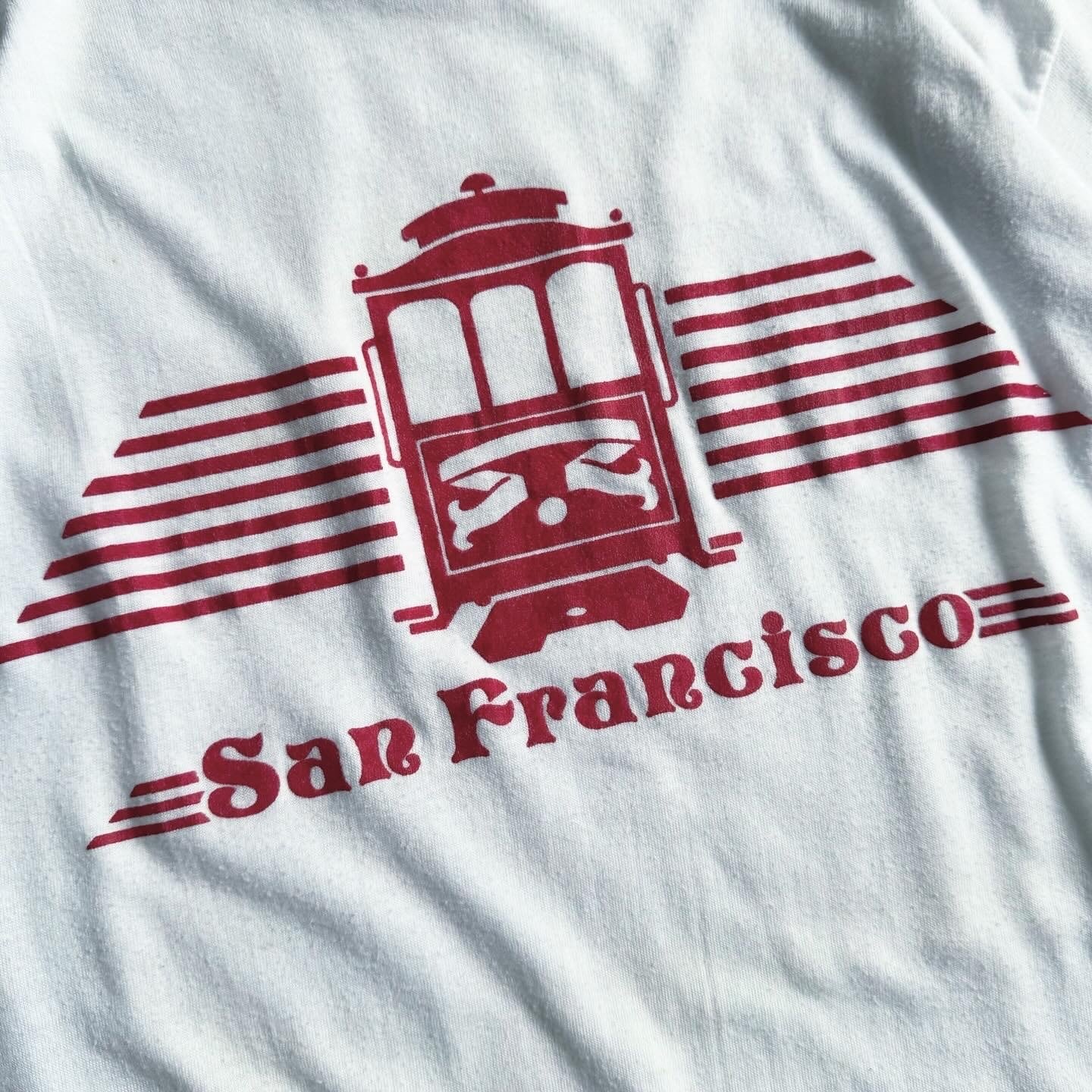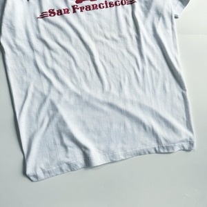 珍しいフロッキープリントのサンフラン フォントも好みです •SIZE M 肩幅 41cm 袖丈 21.5cm 身幅 46cm 着丈 64cm •MATERIAL COTTON 50% POLYESTER 50% •COLOR ホワイト •CONDITION 使用感はございますが、目立った傷や汚れ等はございません。 168cm着用 p811