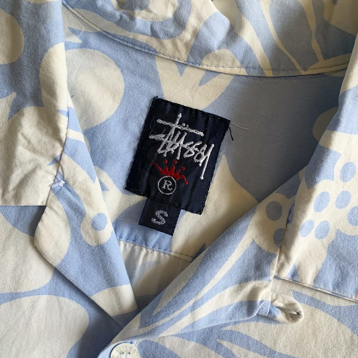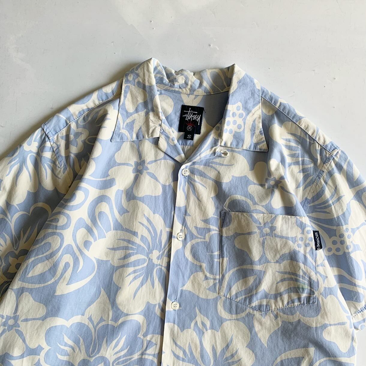 着ると意外といけるハワイアン STUSSYで背景的にも◎ •SIZE S 肩幅 48.5cm 袖丈 22.5cm 身幅 60cm 着丈 72cm •MATERIAL COTTON 100% •COLOR ライトブルー ホワイト •CONDITION 胸ポケットに汚れあり。 me782