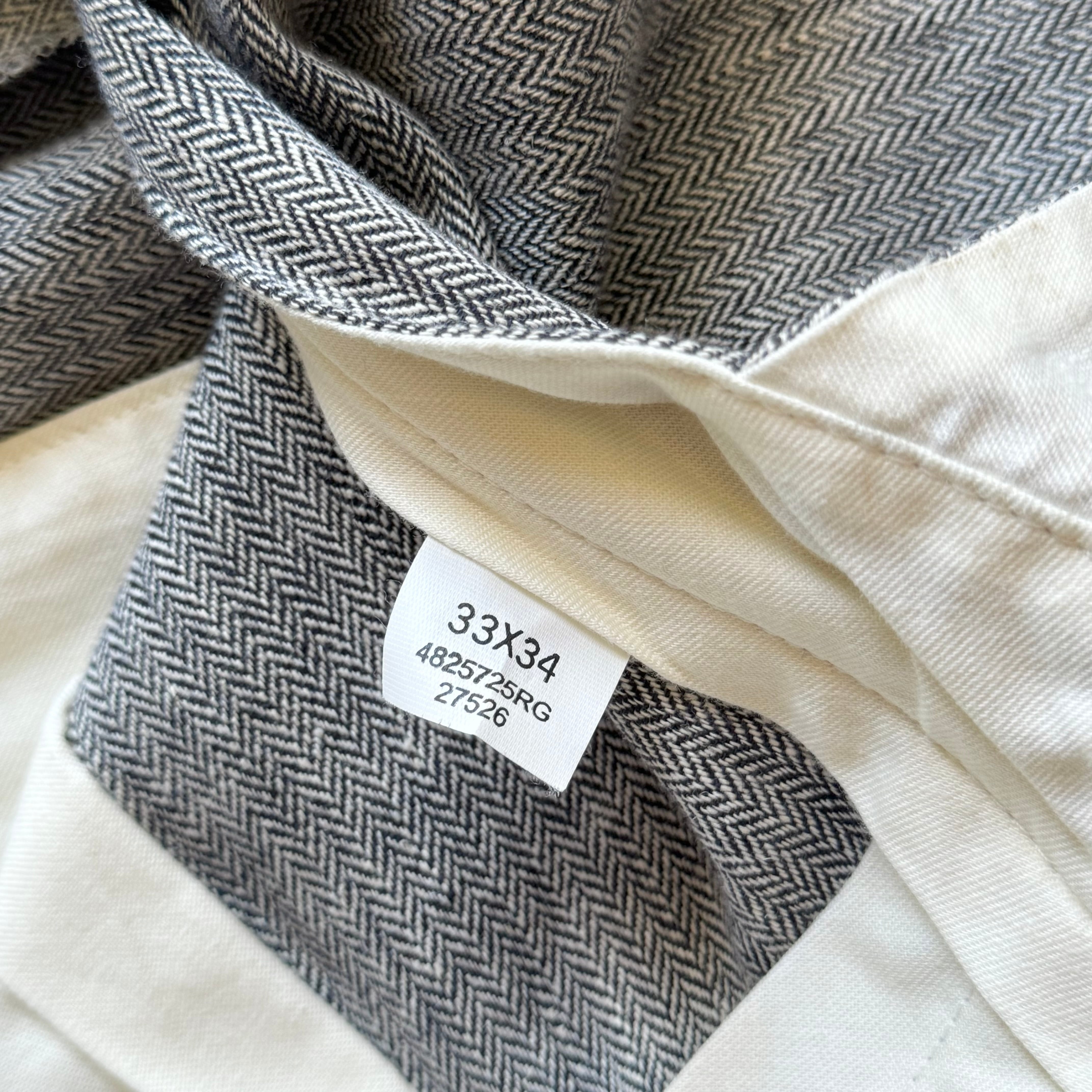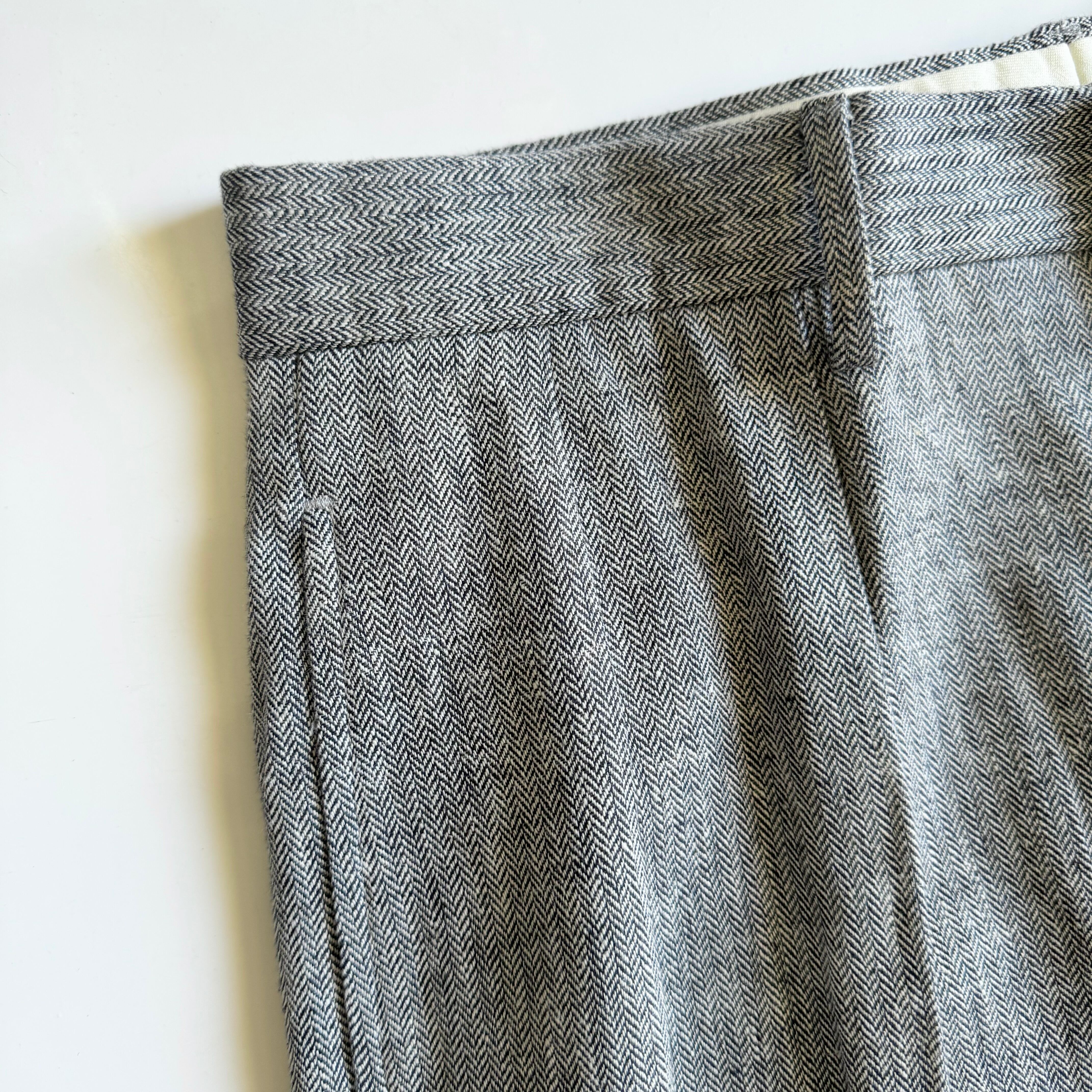 ヘリンボーンのツータック◎ •SIZE 33×34 ウエスト 83cm 股上 32.5cm 股下 74cm わたり 33.5cm 裾幅 24cm •MATERIAL LINEN 55% COTTON 45% •COLOR グレー系 •CONDITION 使用感はございますが、目立った傷や汚れ等はございません。 f478