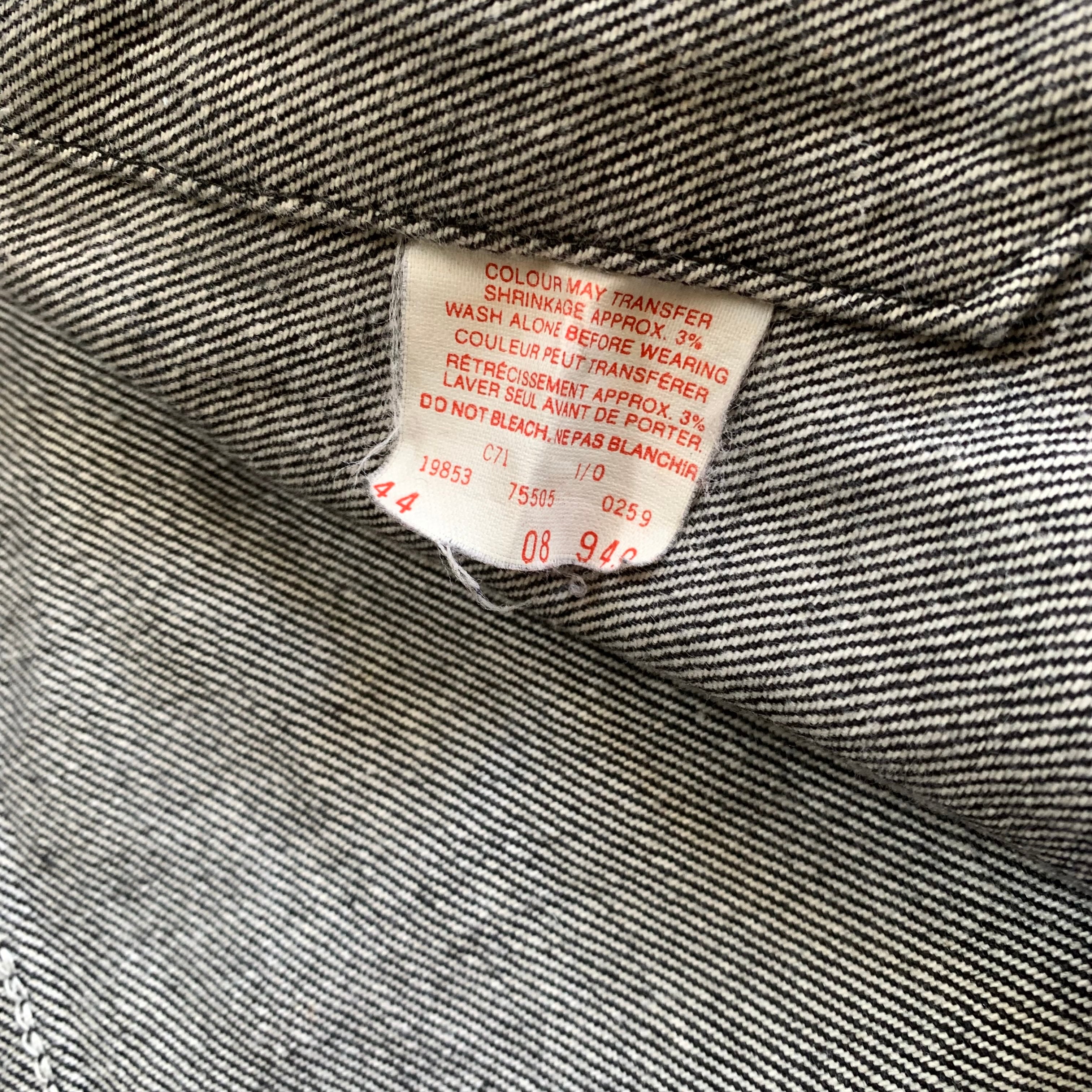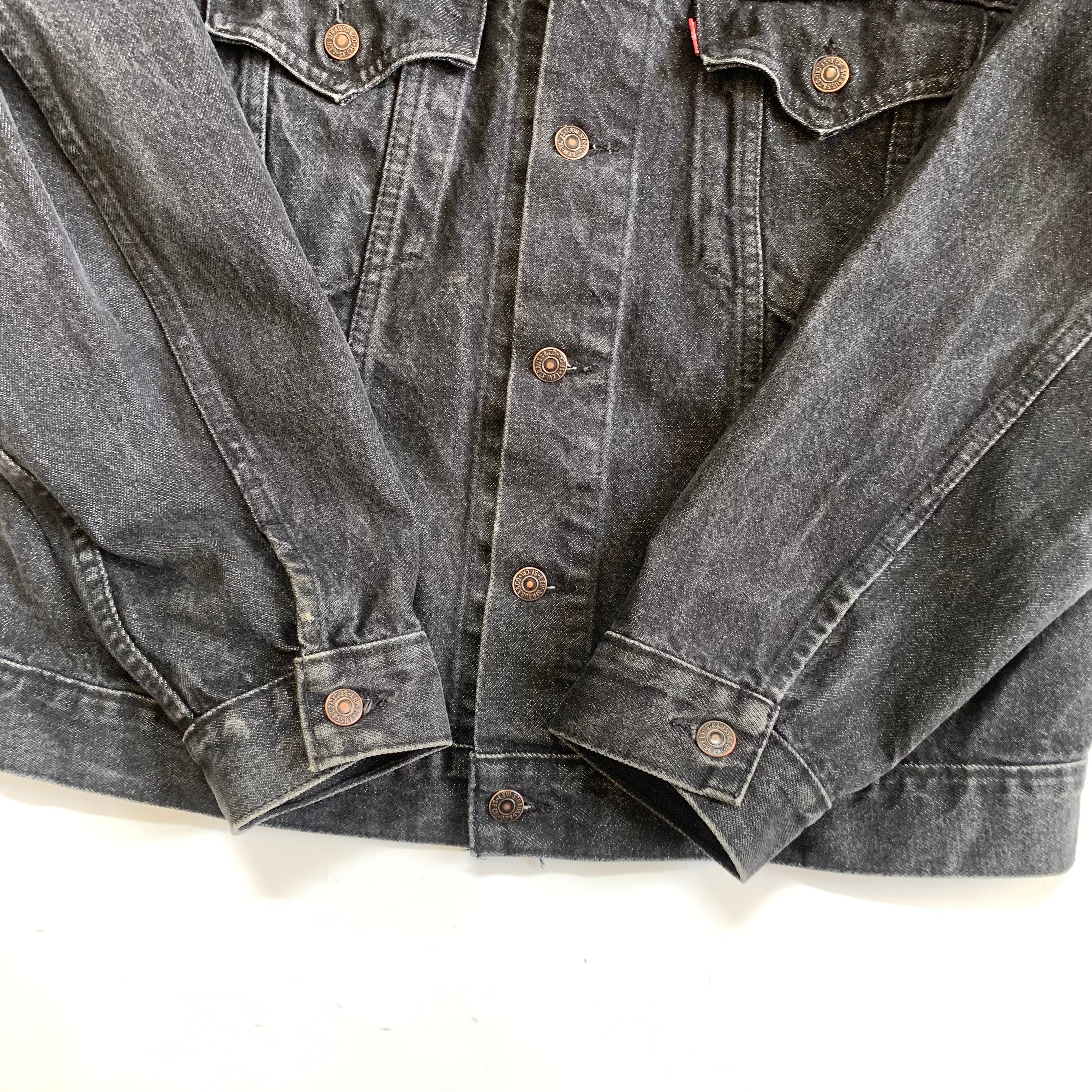 80年代リーバイスのカナダ製”75505” 先染めブラックで間違いないやつ •SIZE 44 肩幅 49cm 袖丈 61cm 身幅 59cm 着丈 60cm •MATERIAL COTTON 100% •COLOR ブラック •CONDITION 使用感はございますが、目立った傷や汚れ等はございません。 f582