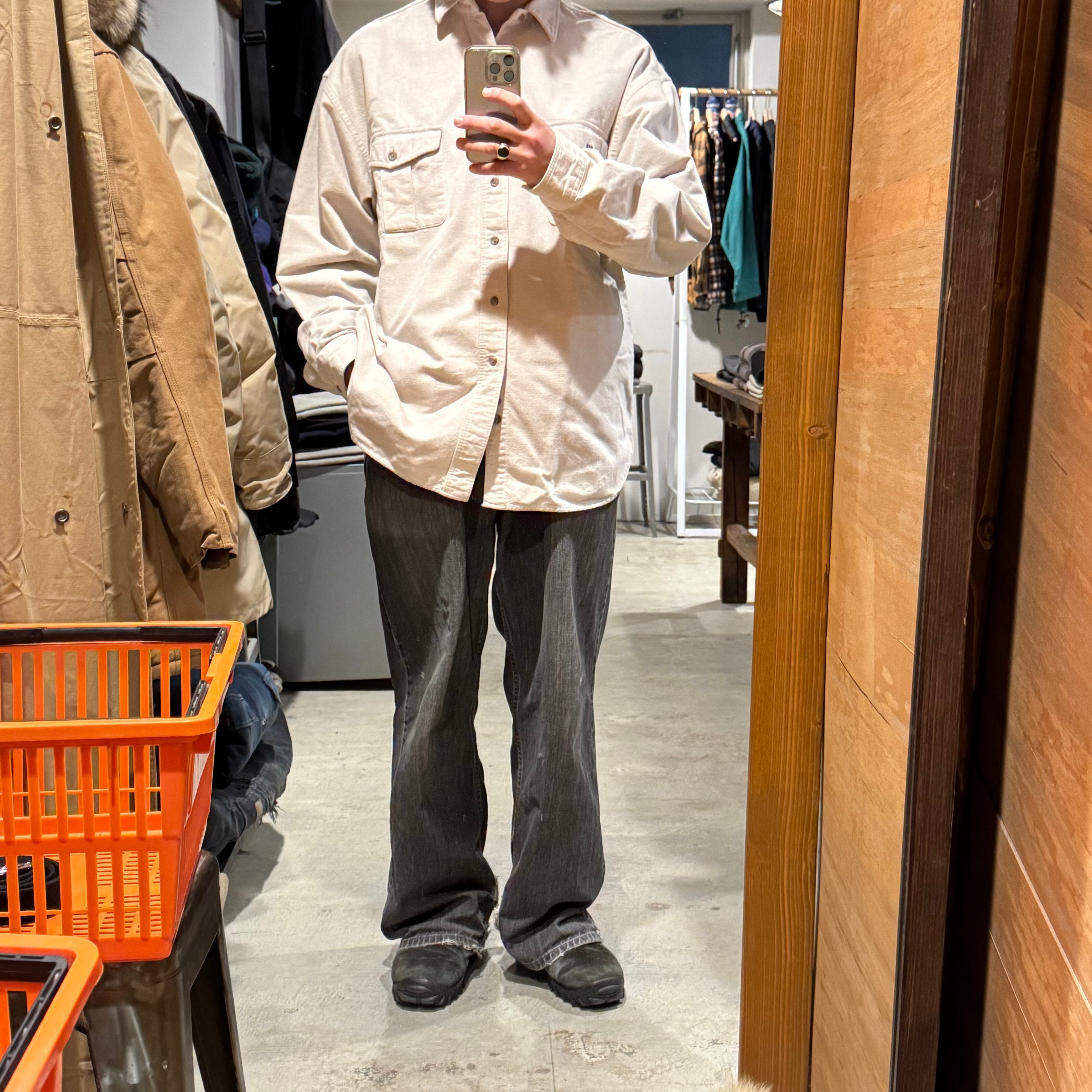 大人の無地シャモア◎ •SIZE 肩幅 57.5cm 袖丈 60.5cm 身幅 67cm 着丈 80.5cm 175cm着用 •MATERIAL COTTON 100% •COLOR オフホワイト •CONDITION 背面に汚れあり。 f598
